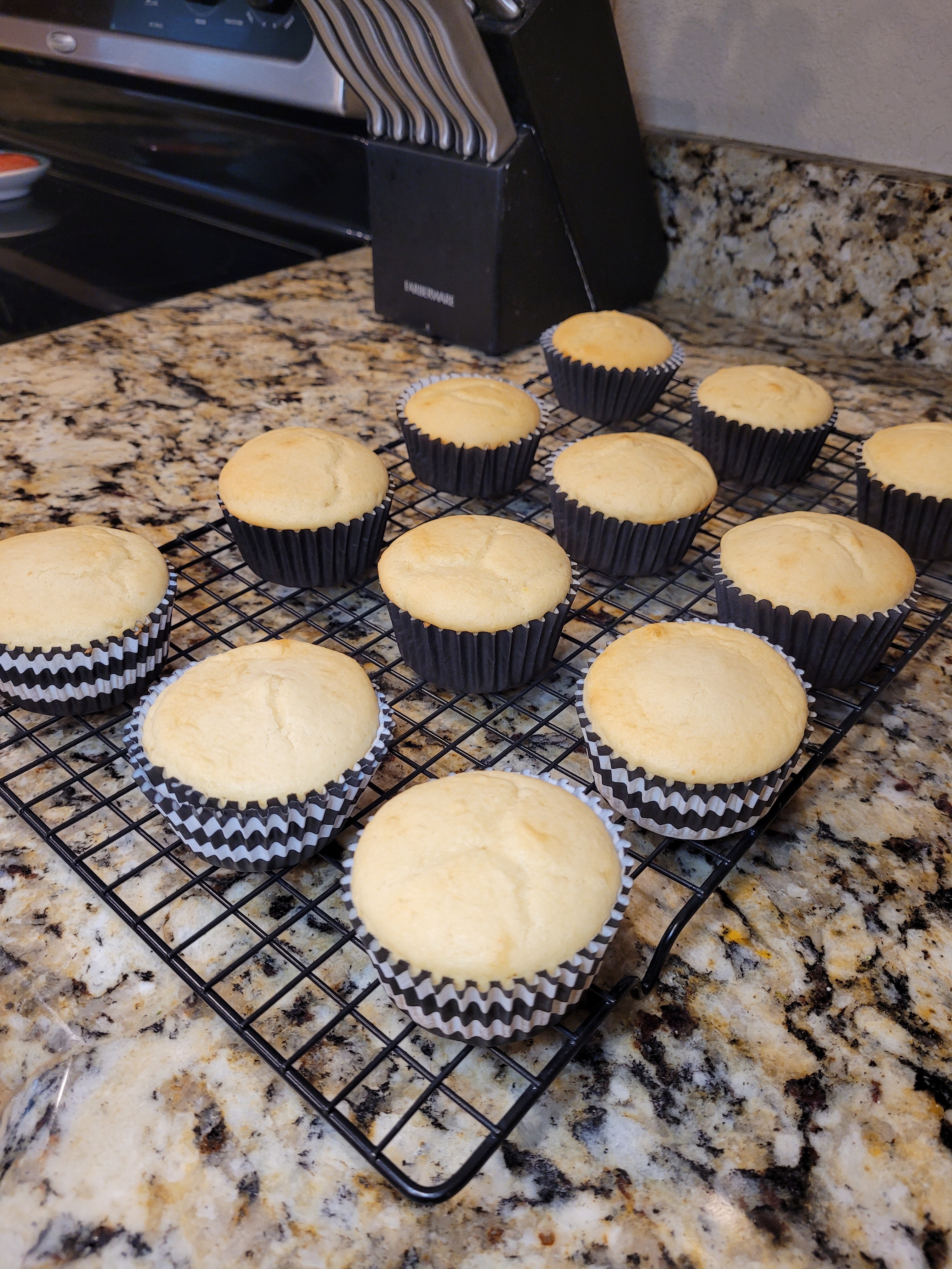 Let the cupcakes cool in the pan for 5-10 minutes before removing to cool completely on a cooling rack. You can put this in the fridge or freezer to speed up the process while you make frosting.