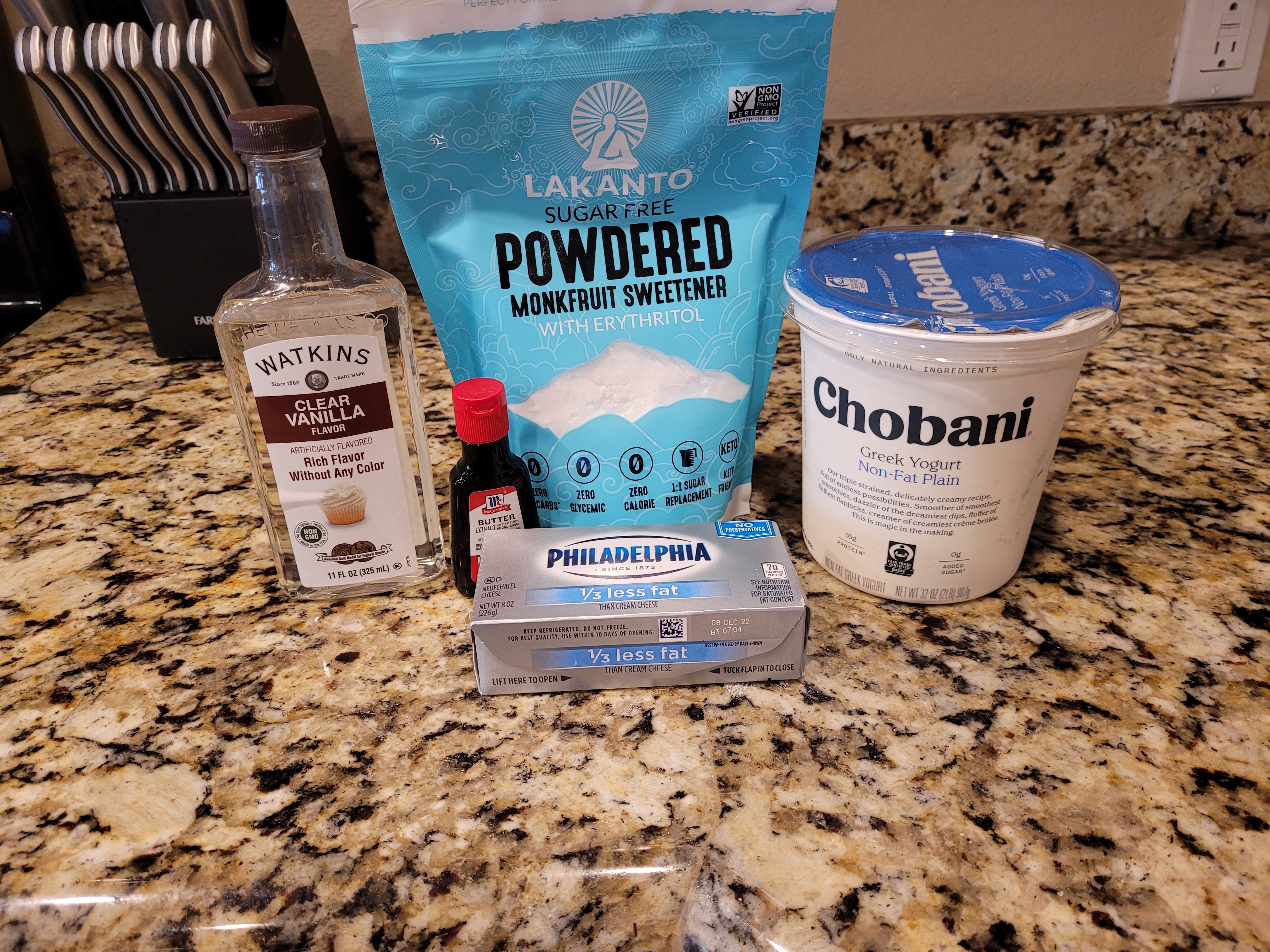 Start by mixing the cream cheese and yogurt until smooth and fluffy, 2-3 minutes. Add in half the powdered monkfruit or sugar and half of the extracts. Mix on low until incorporated, then add remaining monkfruit and extracts. If the frosting seems too thick after mixing together, add 1 tsp of milk at a time until you get an easily spreadable consistency.