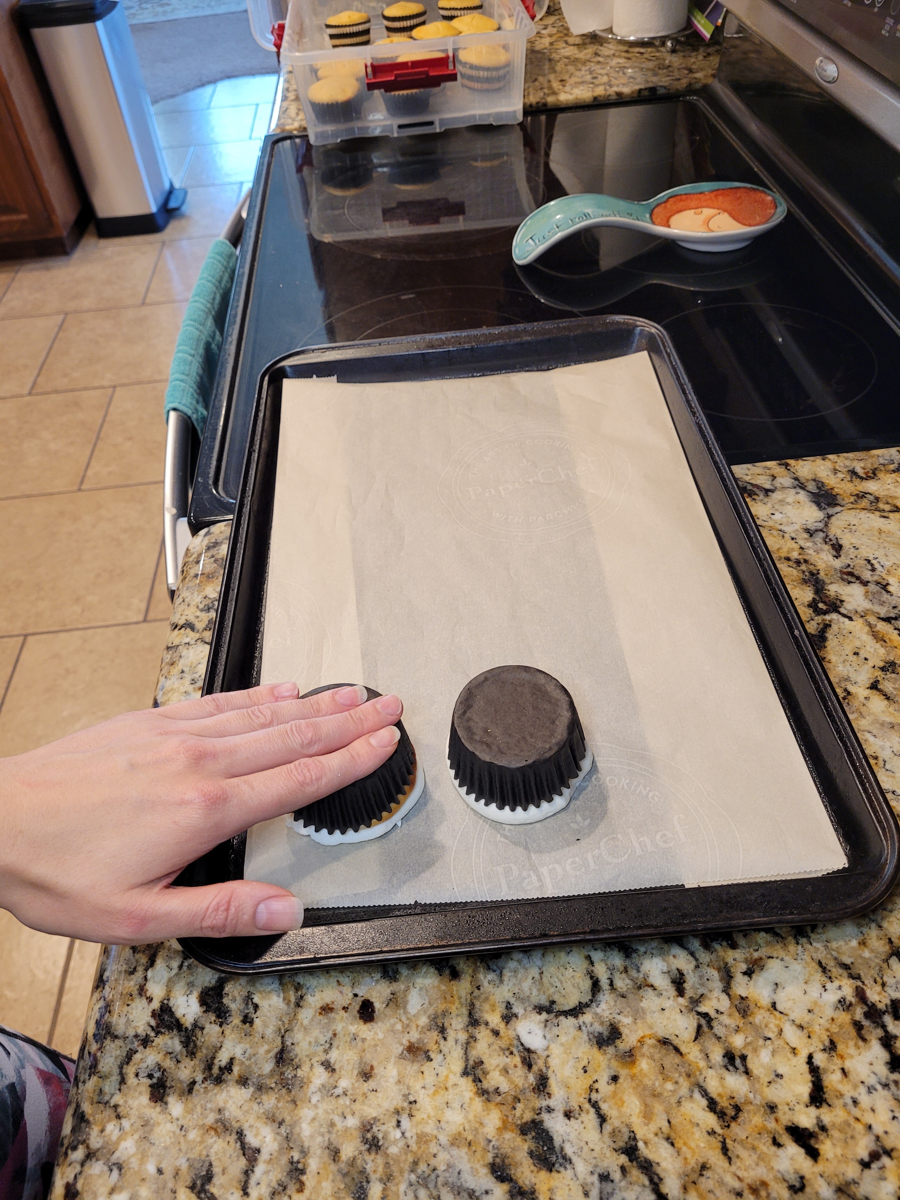 Before you do anything else to the frosting, load some plain white frosting into a piping bag and snip a decent chunk off. Use this to pipe a circle of frosting on top of each of your cooled cupcakes. Then take a sheet of Parchment paper and place it on a large cookie sheet. Flip a cupcake upside down and gently press onto the surface of the Parchment paper. Repeat on all cupcakes, then place in the freezer to set for 30 minutes.
