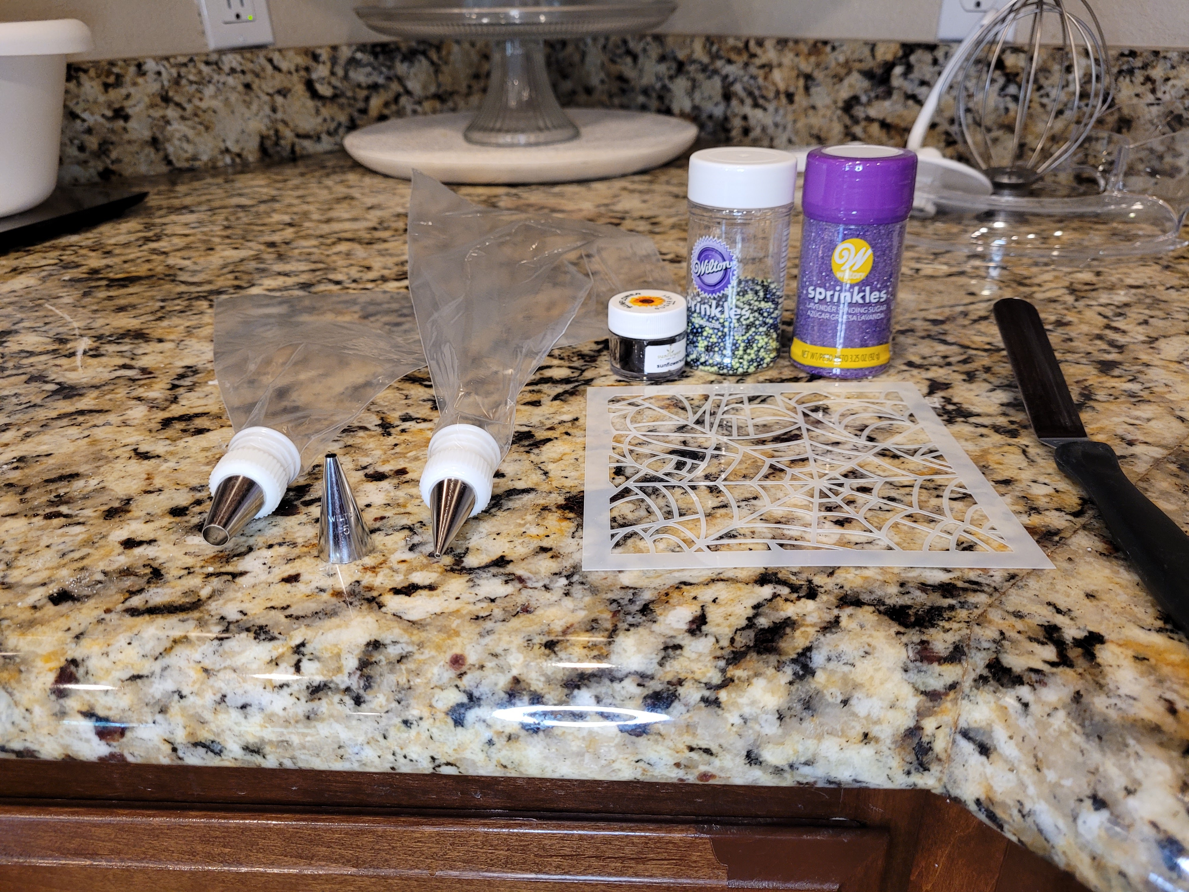I found this template on the web (irony). The whole design process is actually very simple. You only need the template, some black edible glitter, and if you want to also pipe spiders, a #12 round tip and a #5 round tip, and some eerie sprinkles for eyes.