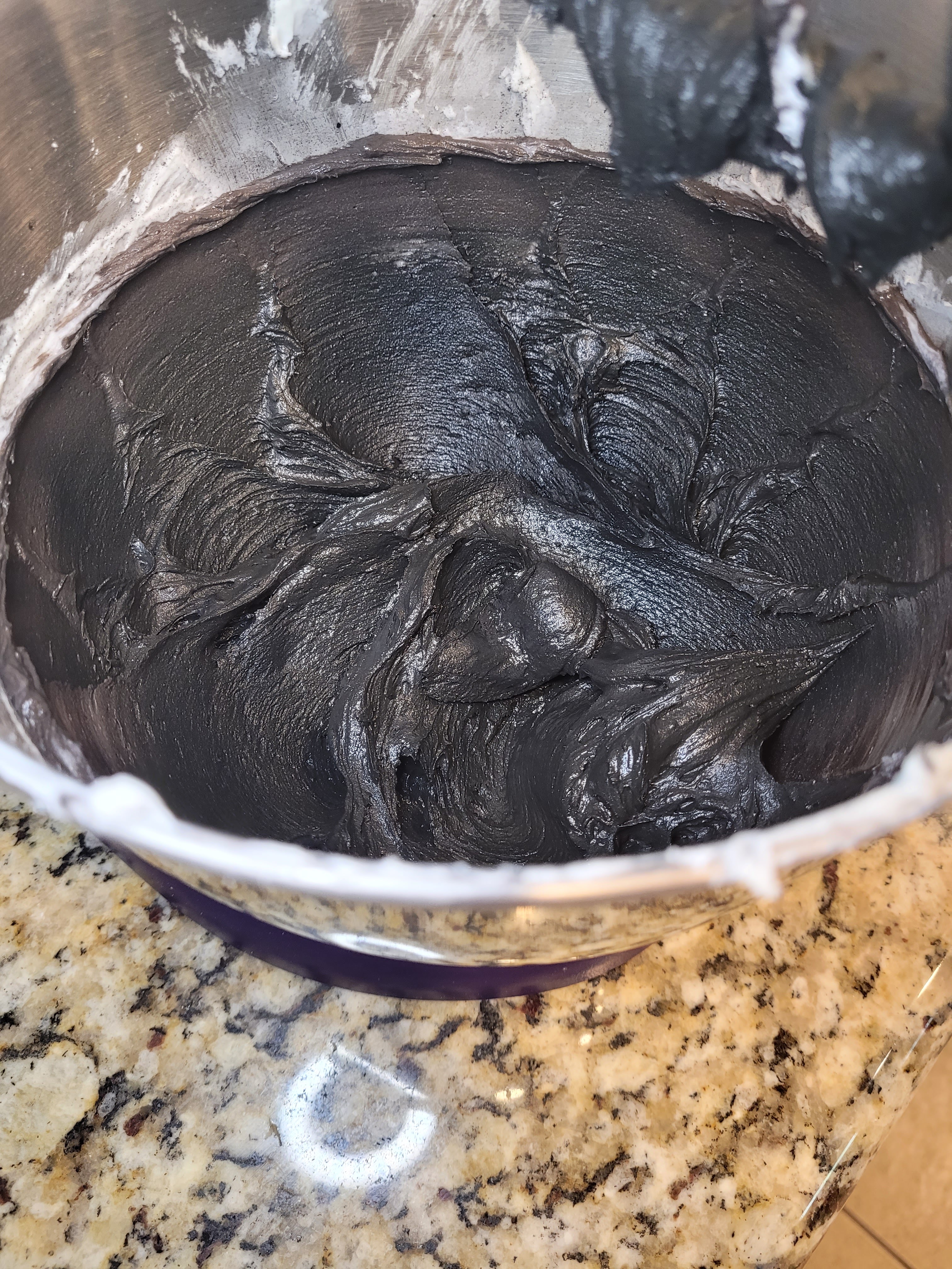 Once you’ve got your cupcakes in the freezer, you can dye your remaining frosting black. Honestly, my spidey senses tingled a little, and I wish I had set aside plain white frosting to dye bright purple or lime green because my black spiders on sparkly black background got lost. So if you want to pipe spiders, save a little frosting to dye a brighter color. Then add 1 ounce of black cocoa and squeeze of black gel dye to the white frosting and mix. Things will probably get pretty thick, so a tablespoon of milk will thin things out.