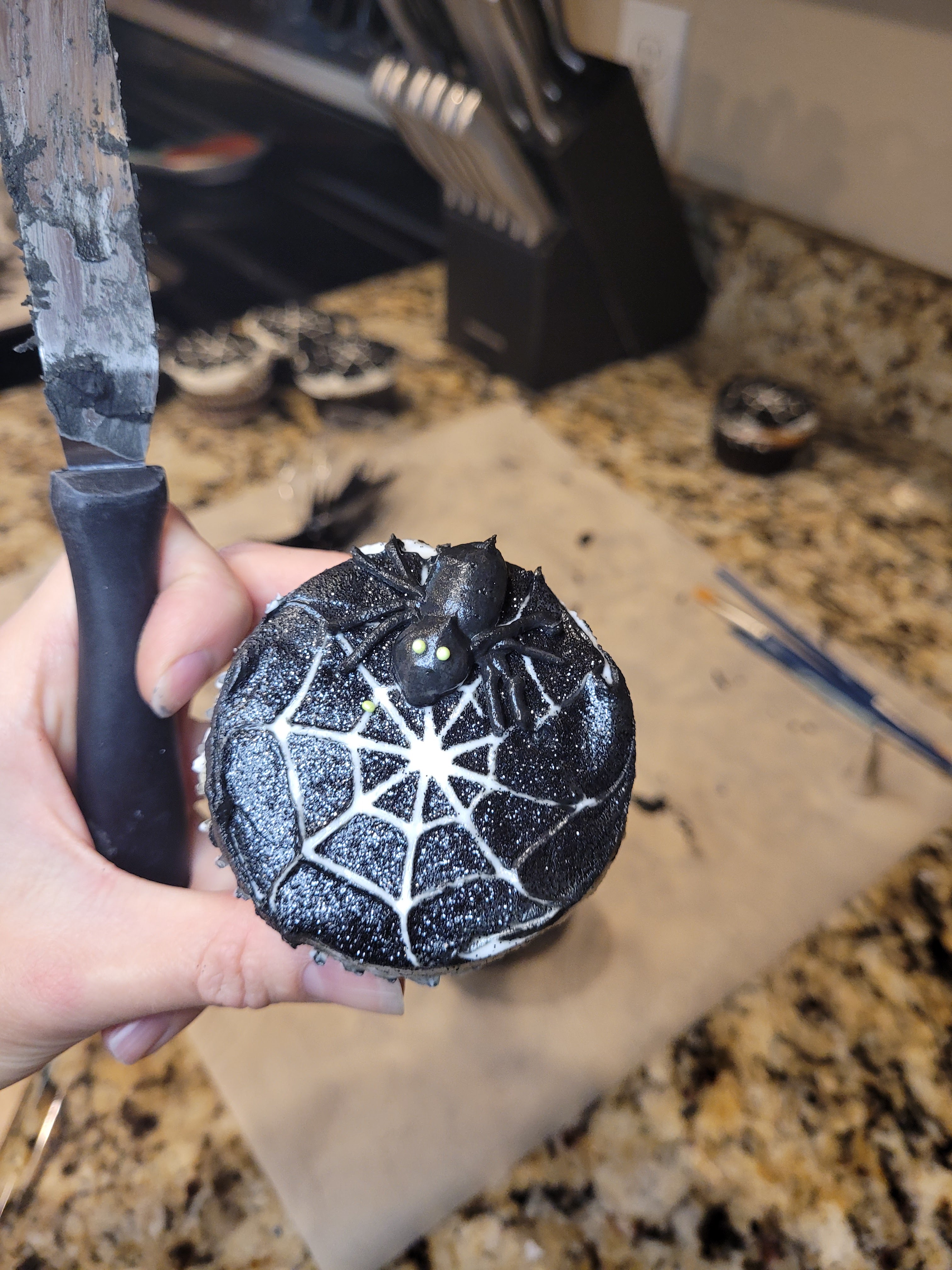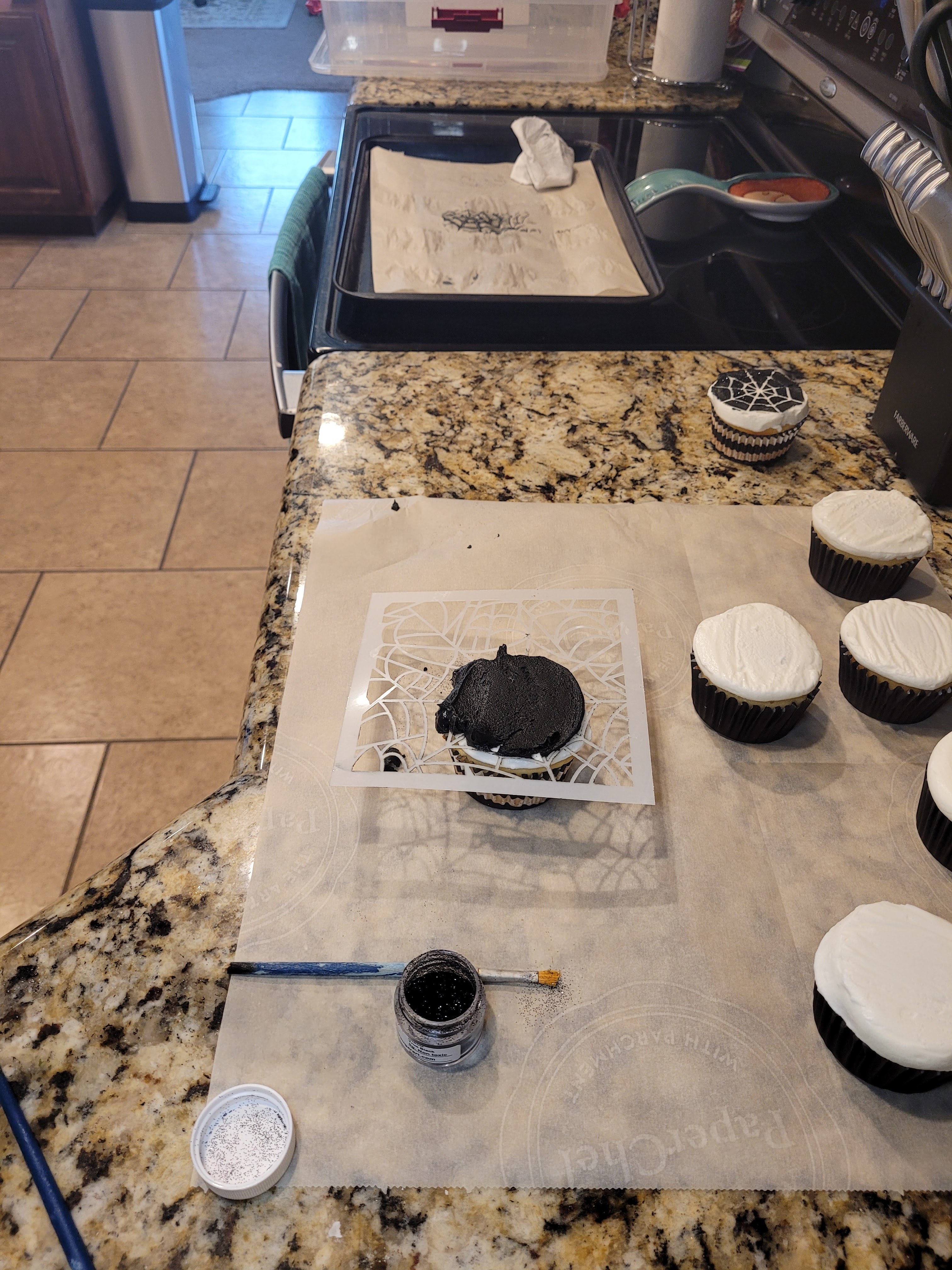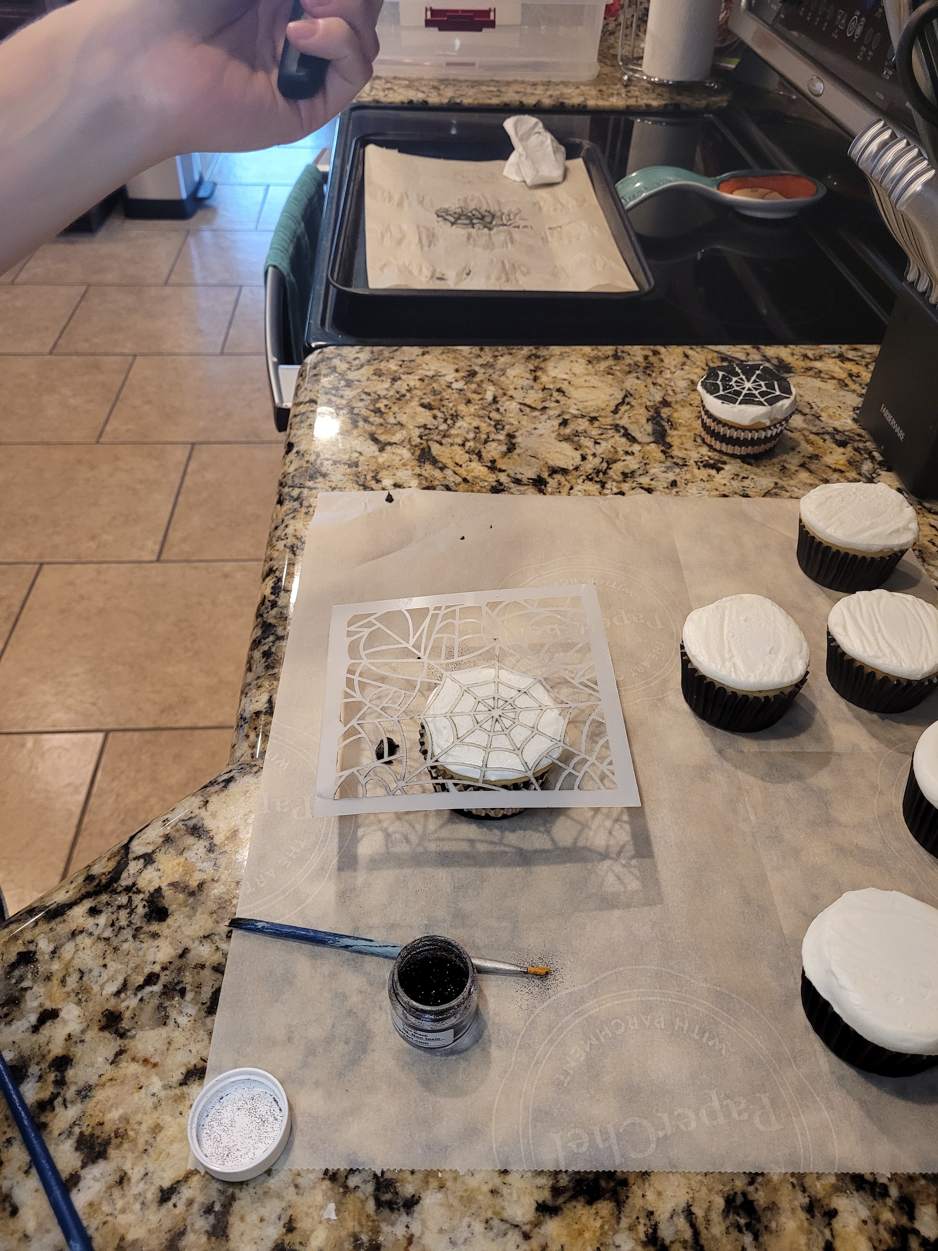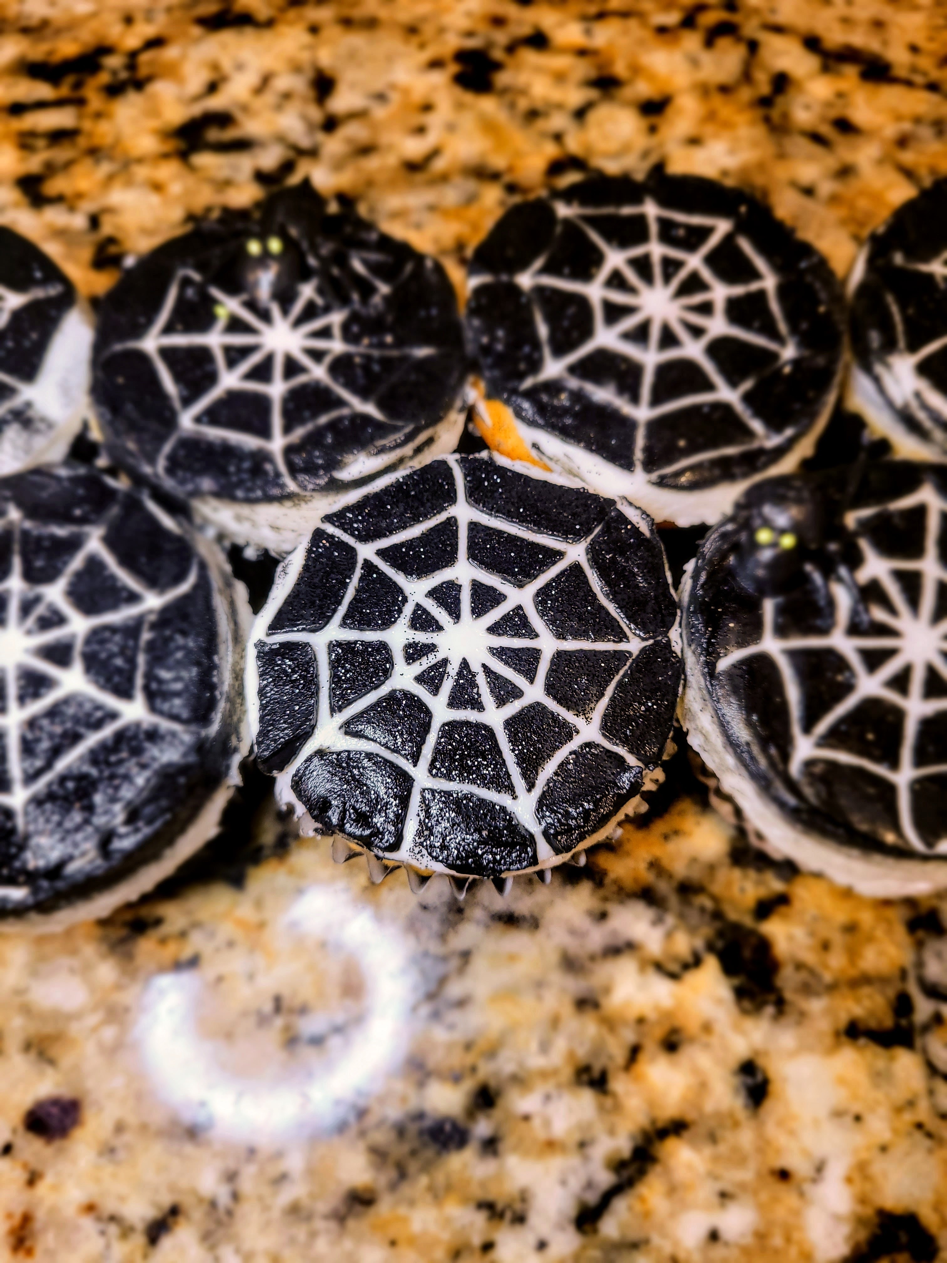 - Pipe cooled cupcakes as desired; review detailed instructions above to use the stencil and pipe spider bodies