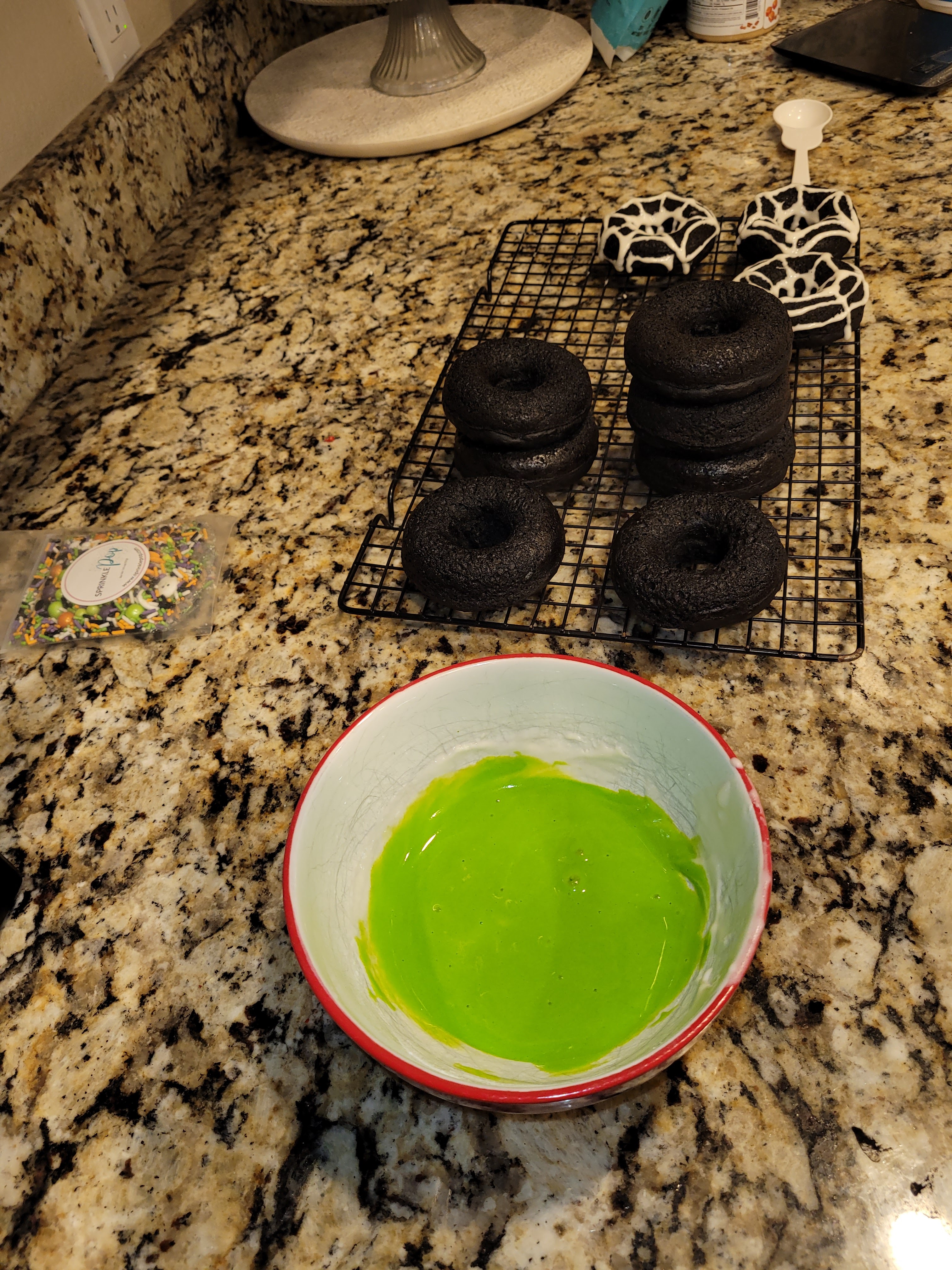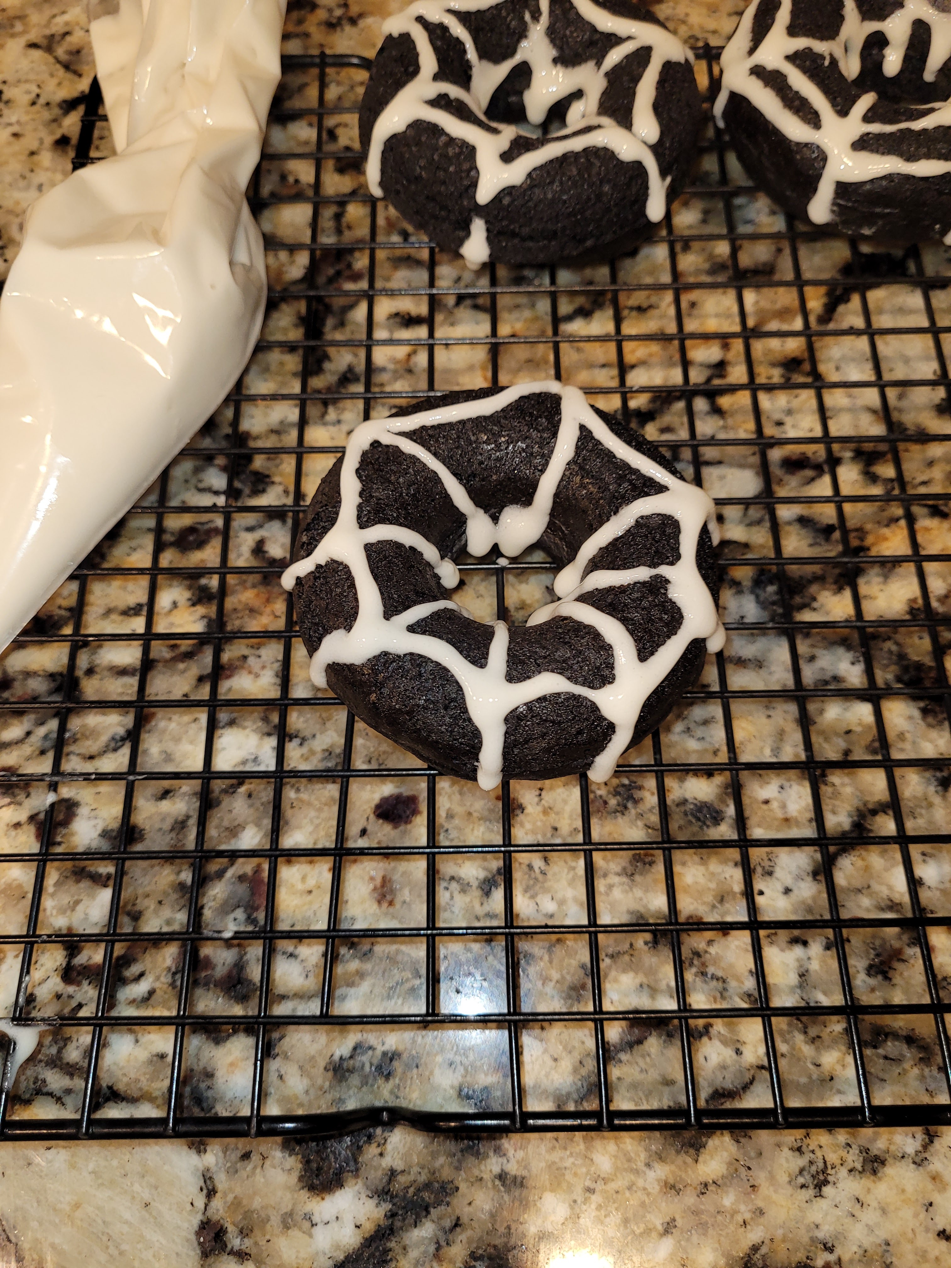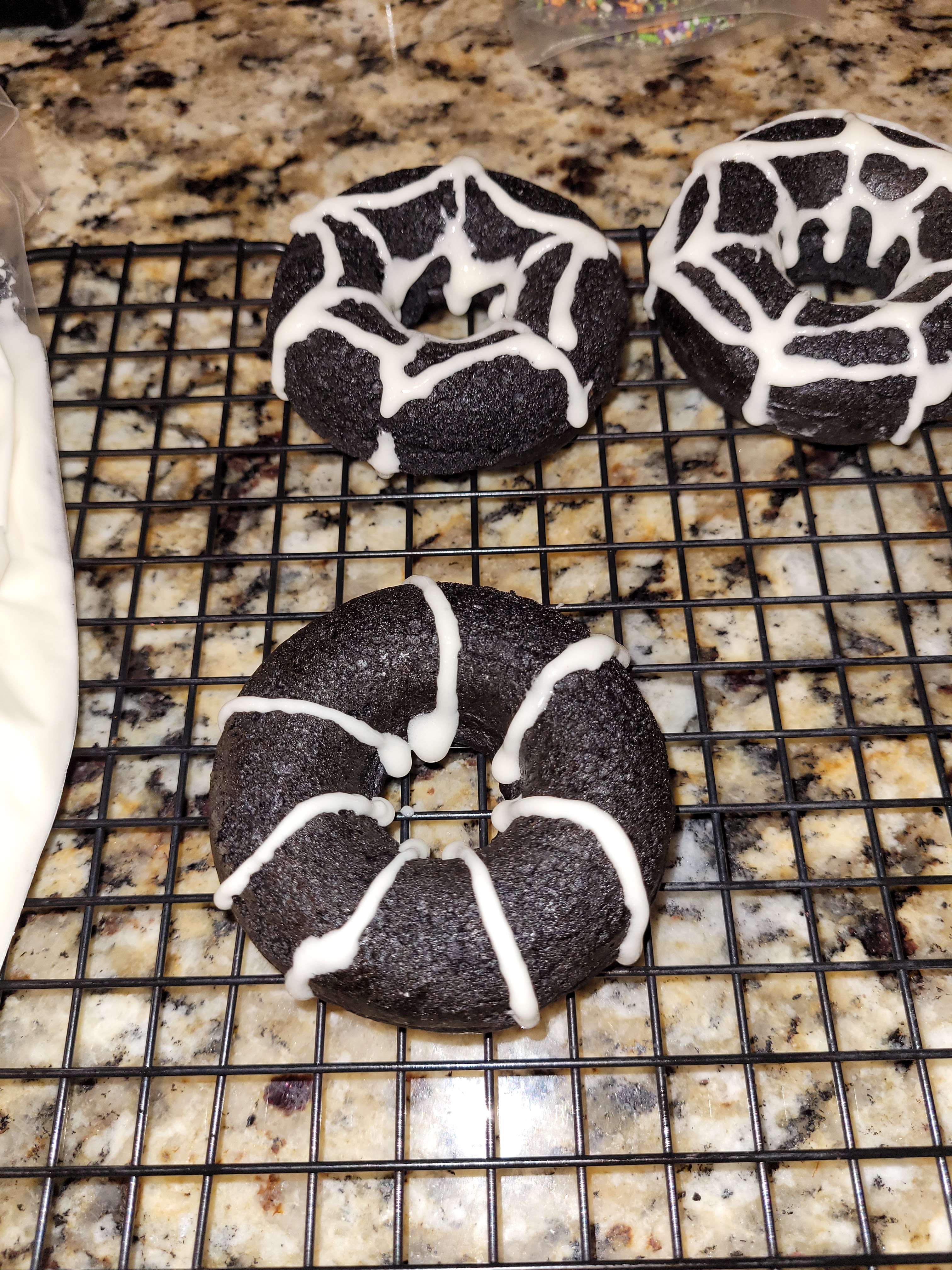 - Once donuts have cooled 15 minutes, dip into glaze and top with sprinkles (for spiderweb donuts, see instructions above)