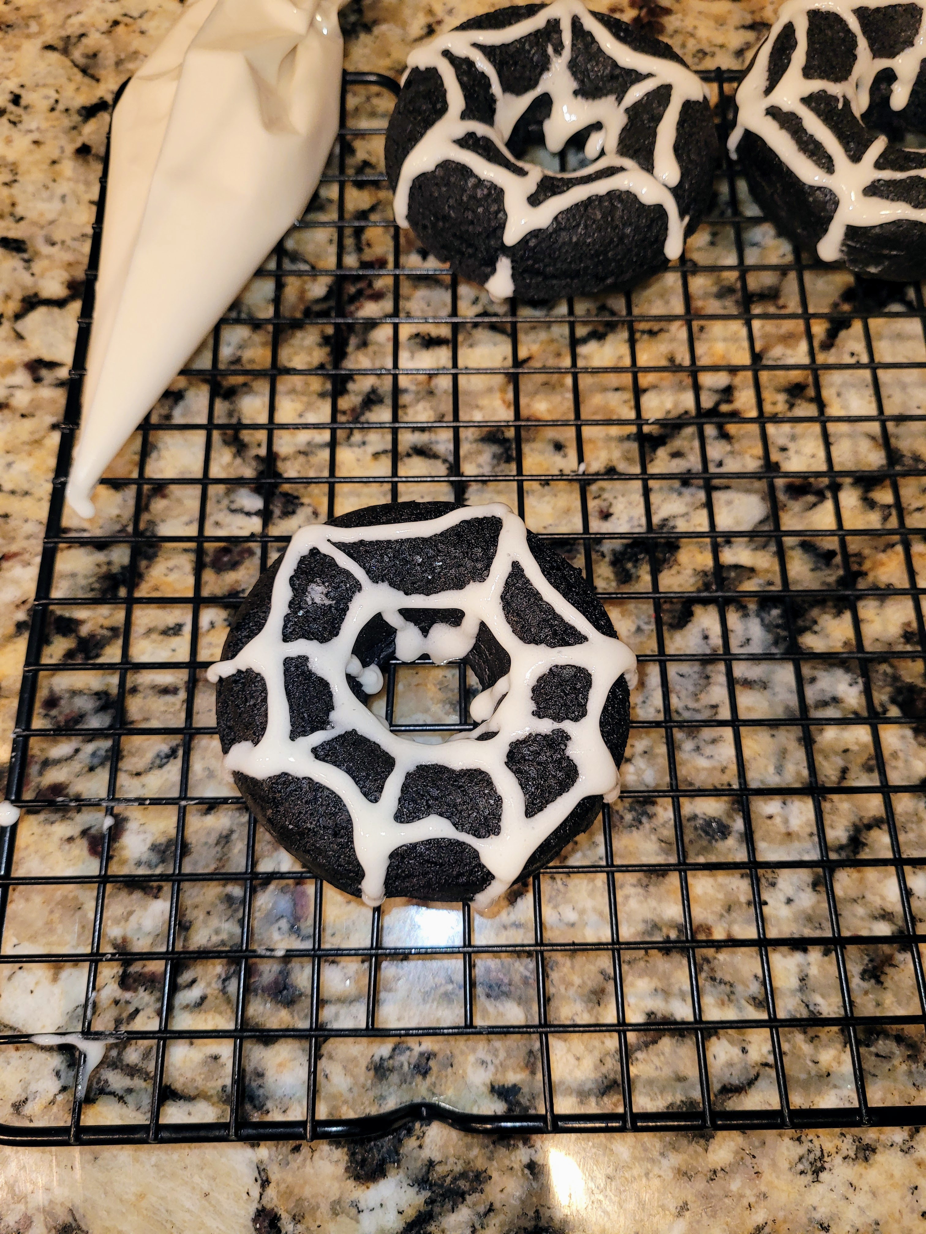 To finish, draw another set of curved lines closer to the center of the donut, and you’ve got more edible spiderwebs than probably necessary, but hey, it’s Halloween.