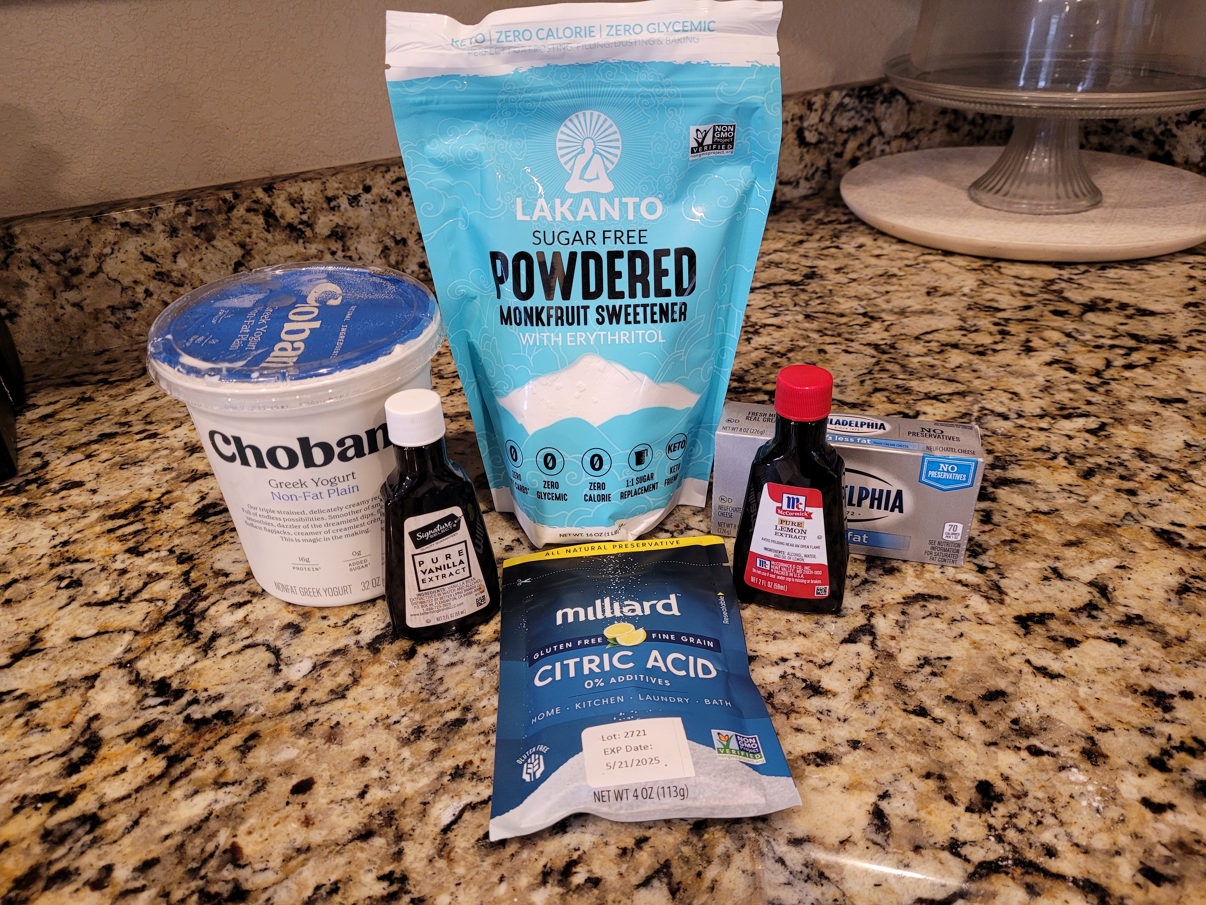 - To make frosting, whisk cream cheese and yogurt for 3 minutes before adding in half the powdered monkfruit and the extracts, mixing well.