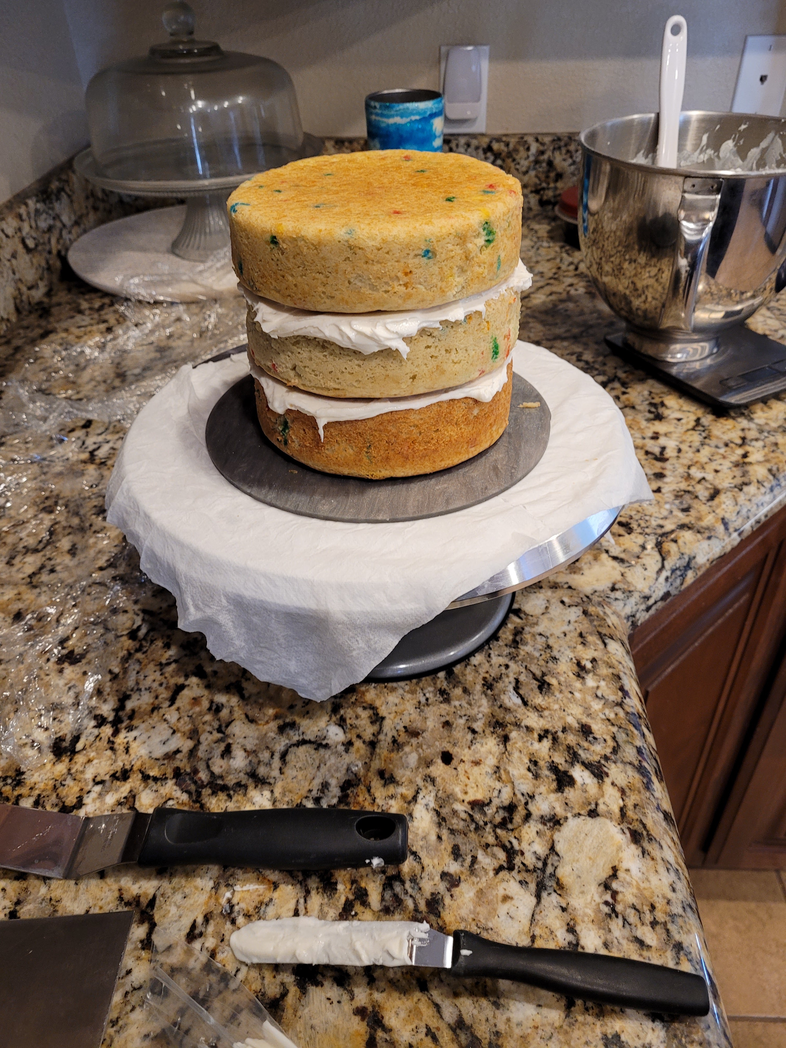 Whip the cream cheese and yogurt with a paddle attachment in your stand mixer until fluffy, about three minutes. Add in half the monkfruit, citric acid, and both extracts. Blend well, then scrape the bowl before adding the remaining monkfruit and 1 TBS milk; if the frosting is too stiff, add another TBS milk. To assemble, you just need to slather a layer of buttercream on top of a cooled cake layer, then add another layer (I always place them face down so the smooth surface on the bottom of the cake is now on top), then place the final layer on top. Then coat the side (but not the top) of the cake with plain white frosting. Citric acid also makes frosting BLINDINGLY WHITE (like ‘my legs in the winter’ level of white), which again, gave me pause, because what is it going to do to my insides if it bleaches my frosting?