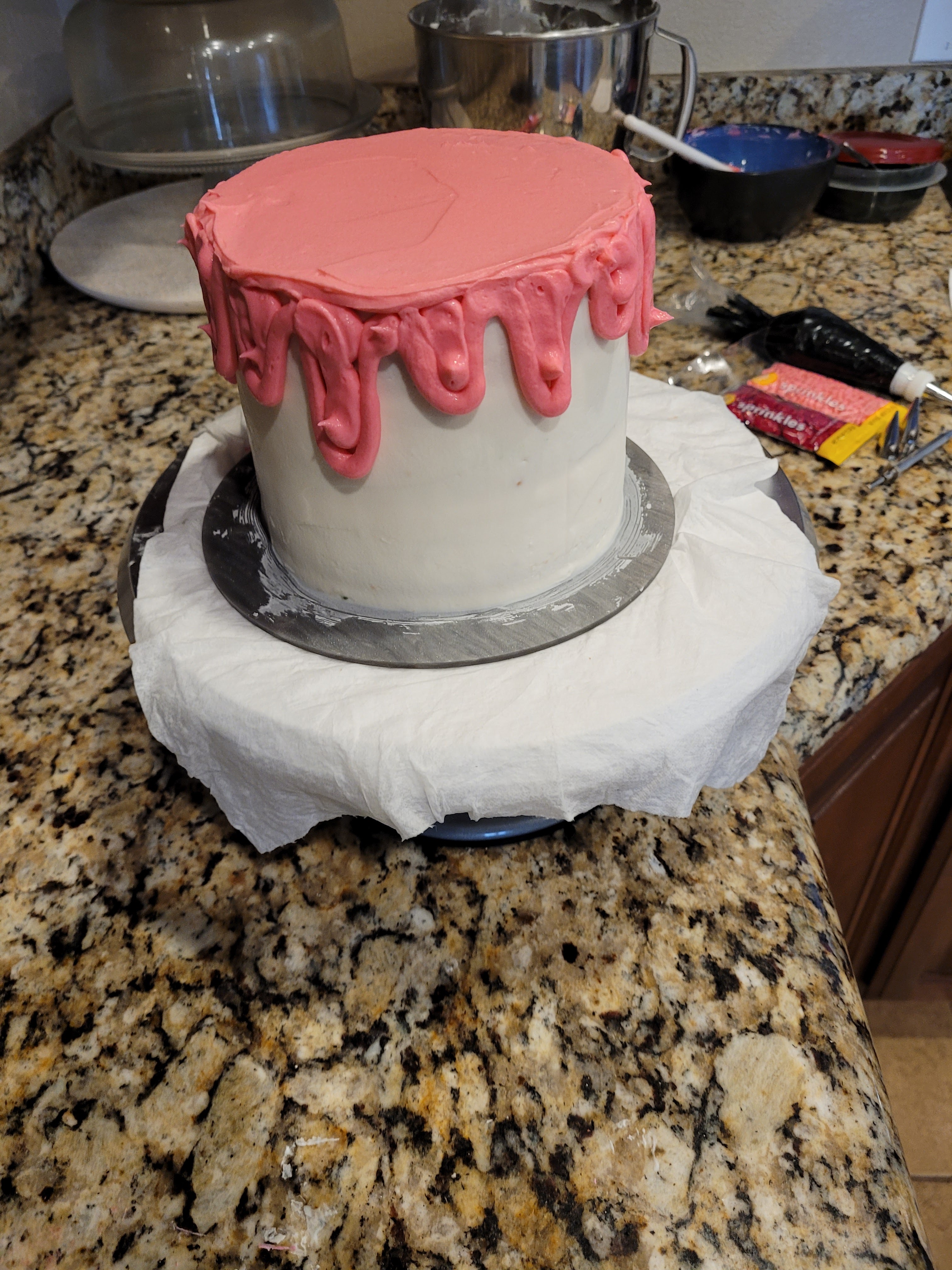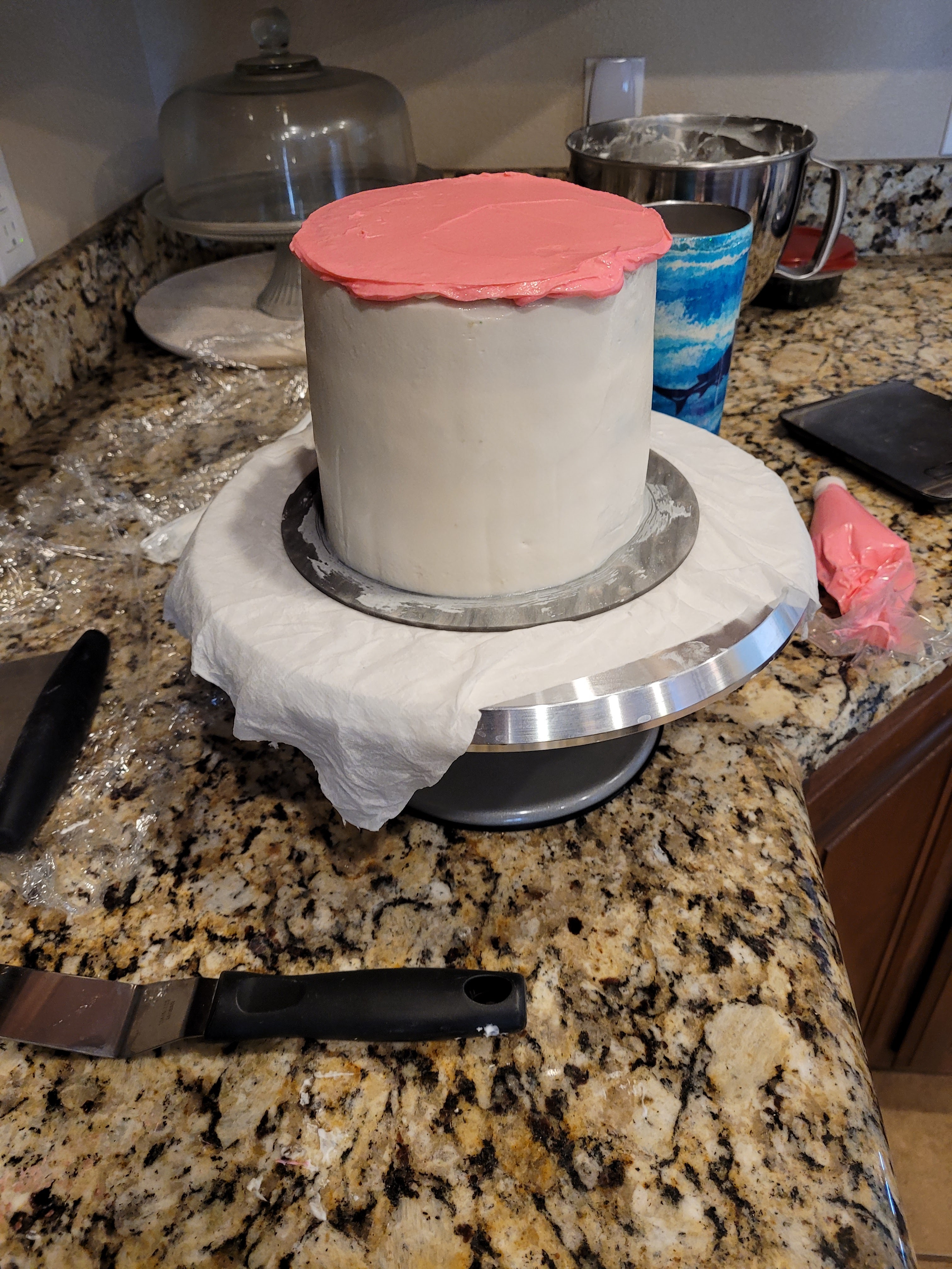 I topped my cake with a bit of pink frosting, smoothed, and then froze the whole thing for 20 minutes so my frosting would crust. I smoothed out any bumps on the cake with a plain Viva paper towel after this.