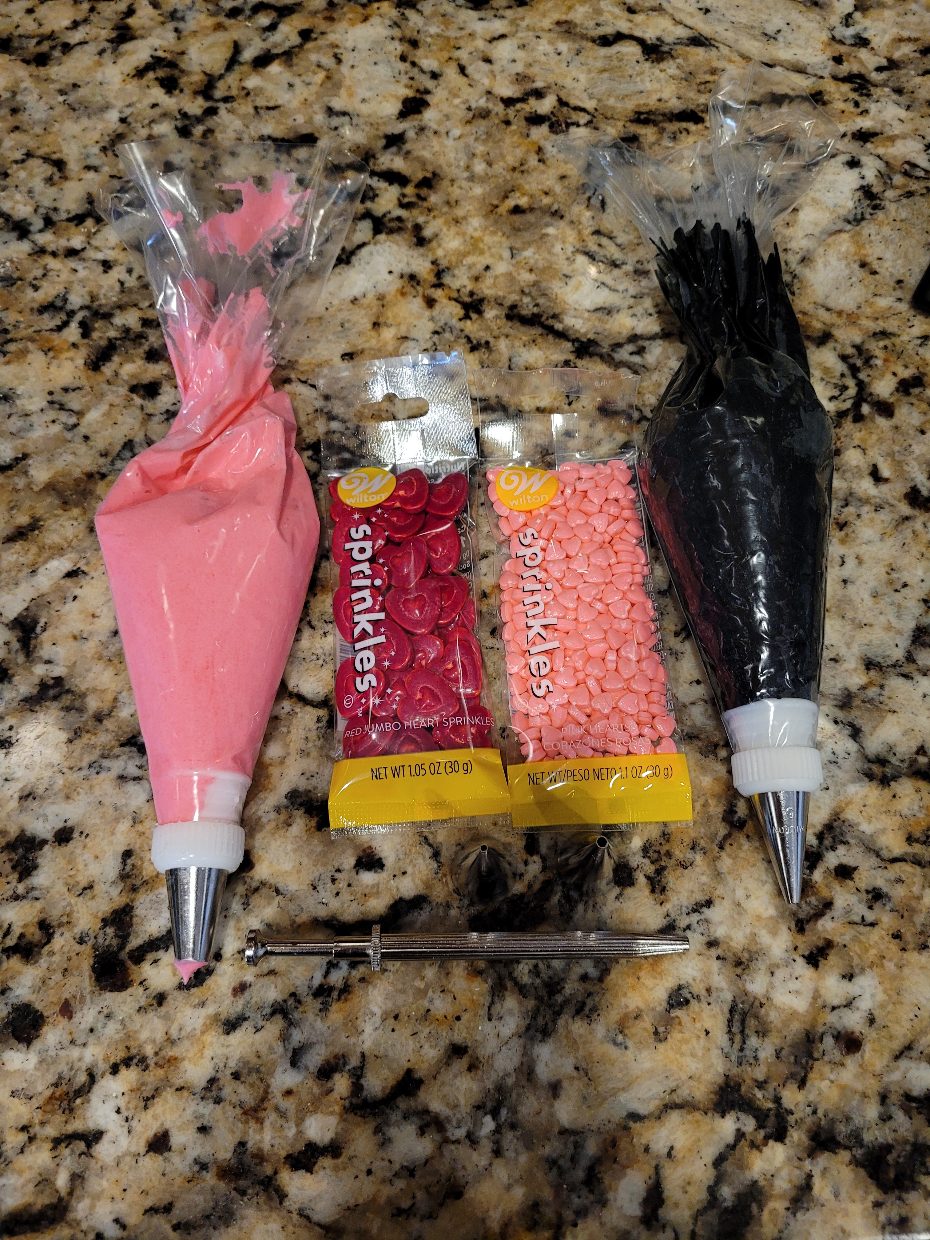 Instead of wondering whether my intestines and stomach needed to prepare for bleaching, I gathered up some hot pink, red, and black gel dyes and rounded up the Valentine’s sprinkles. I divided my frosting into thirds, a larger heaping to dye hot pink, and two smaller heaps to dye black and red. I loaded my pink frosting into a piping bag with a #12 round tip, my black frosting into a piping bag with a #5 tip (I also had my #3 and #2 tips on hand to swap out), and my red frosting into a piping bag with a 2D tip (1M would also work). That little tool you see in the middle above is a grabber that works EXCELLENTLY to place sprinkles onto a cake; big ups to my boss for sending that in my birthday gift…it is truly my new favorite thing ever. It also works well to threaten husbands out of the kitchen and away from your bowl of frosting, FYI.