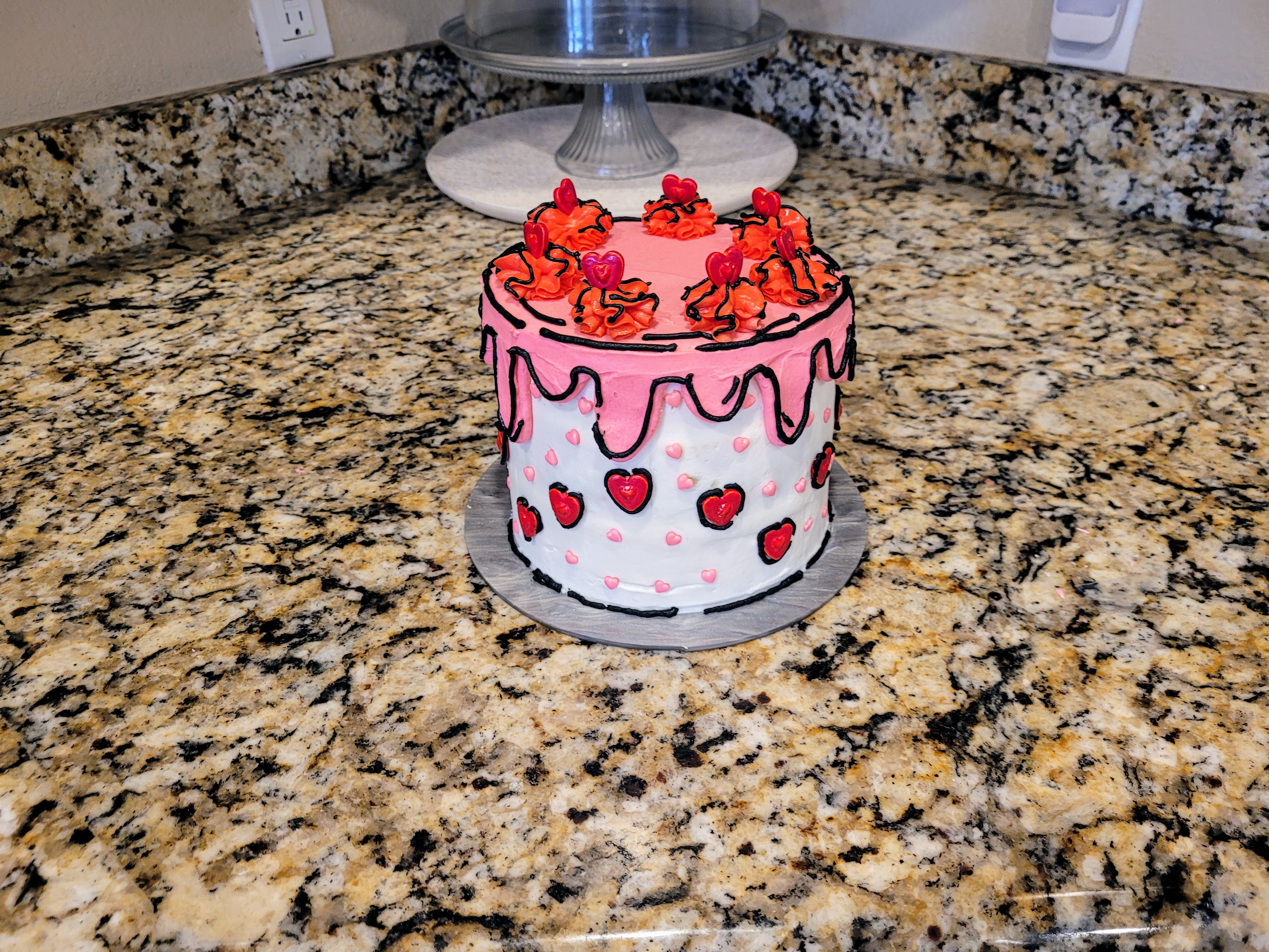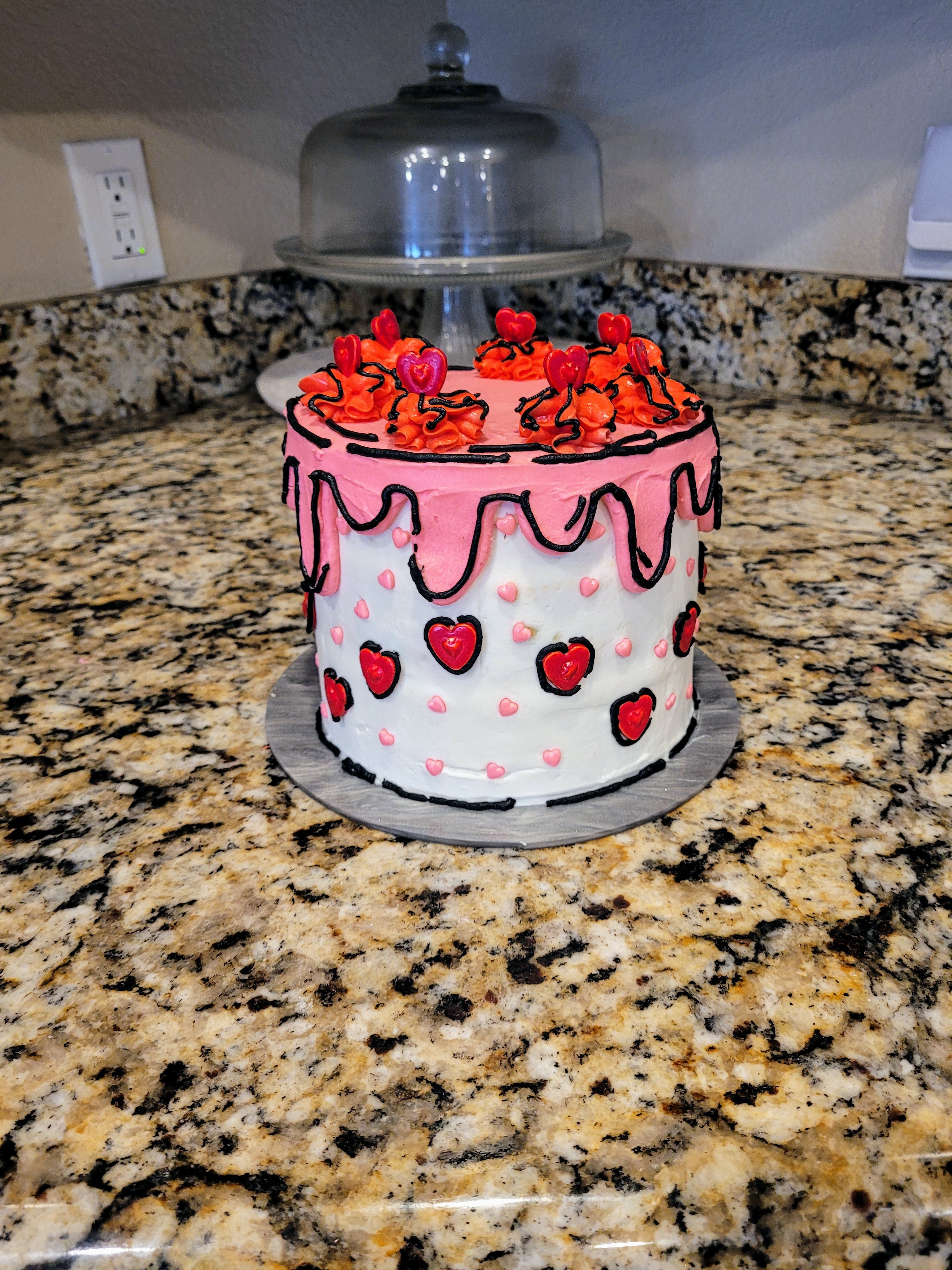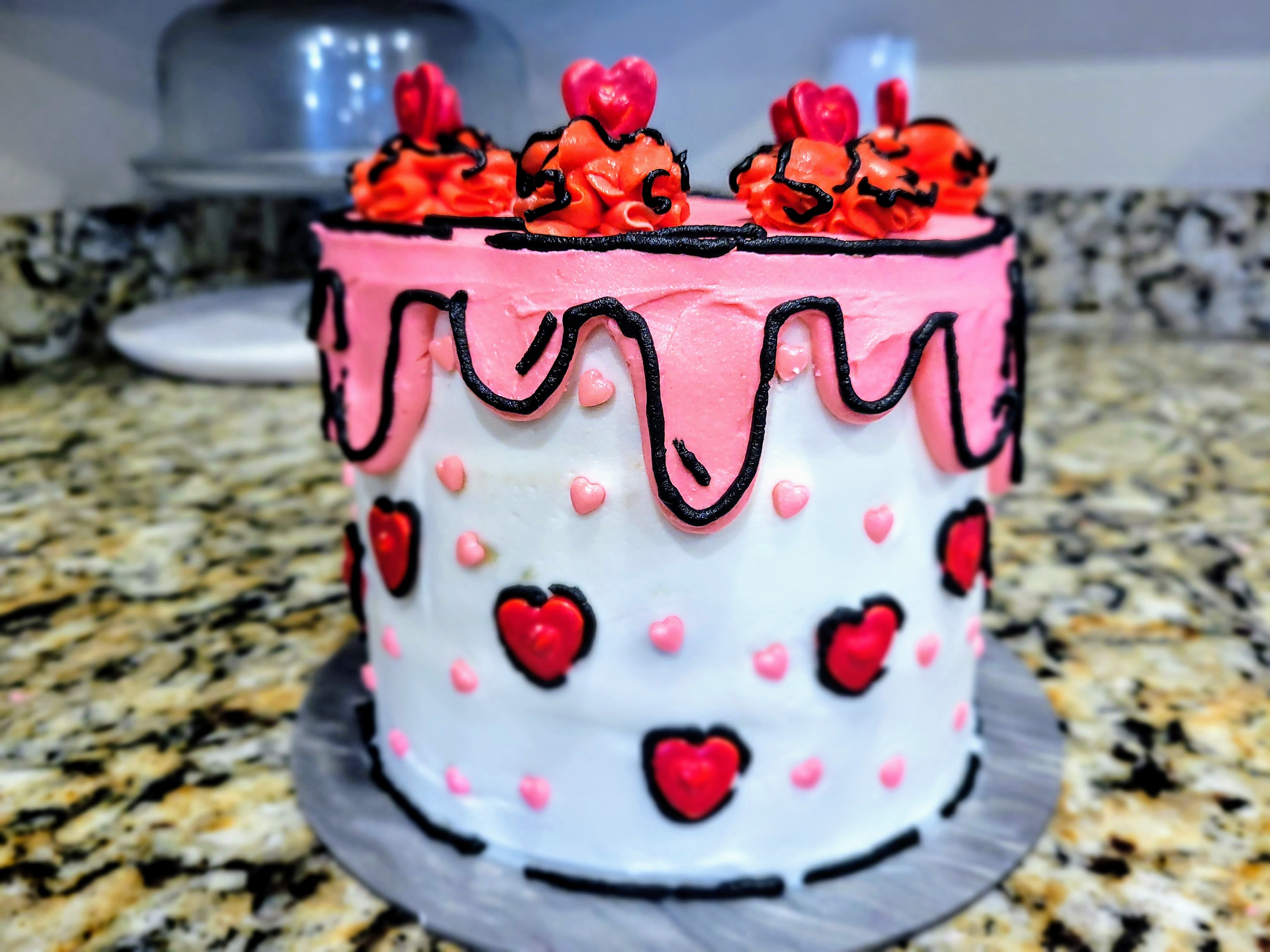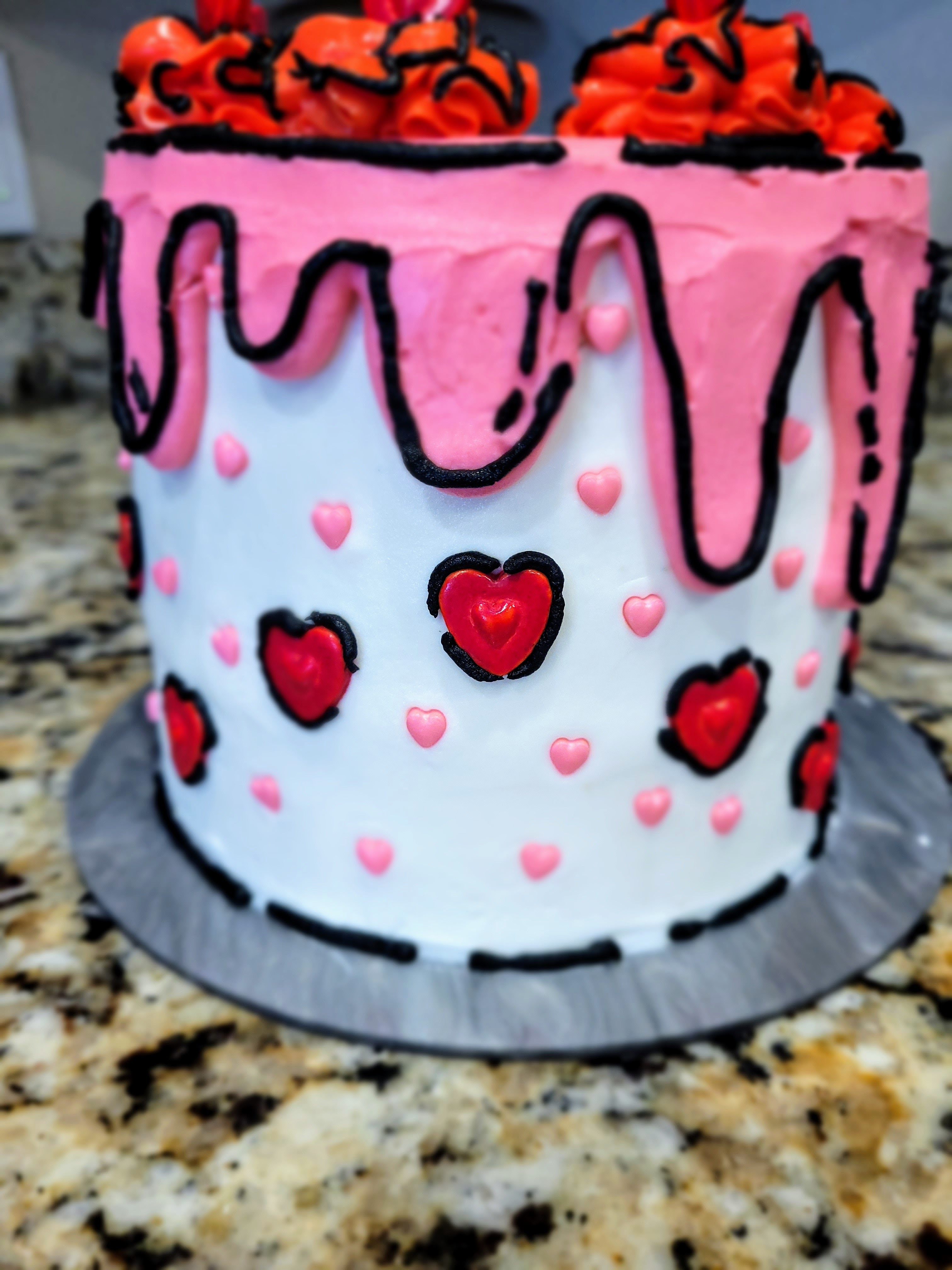 Now, outline the drips with more black frosting. I added in a few “shadows” of overlapping black. Then I used my sprinkle grabber to put red hearts all over the side of the cake. I outlined these with a #3 tip in little sections; some went all around the hearts, others outlined in little chunks.