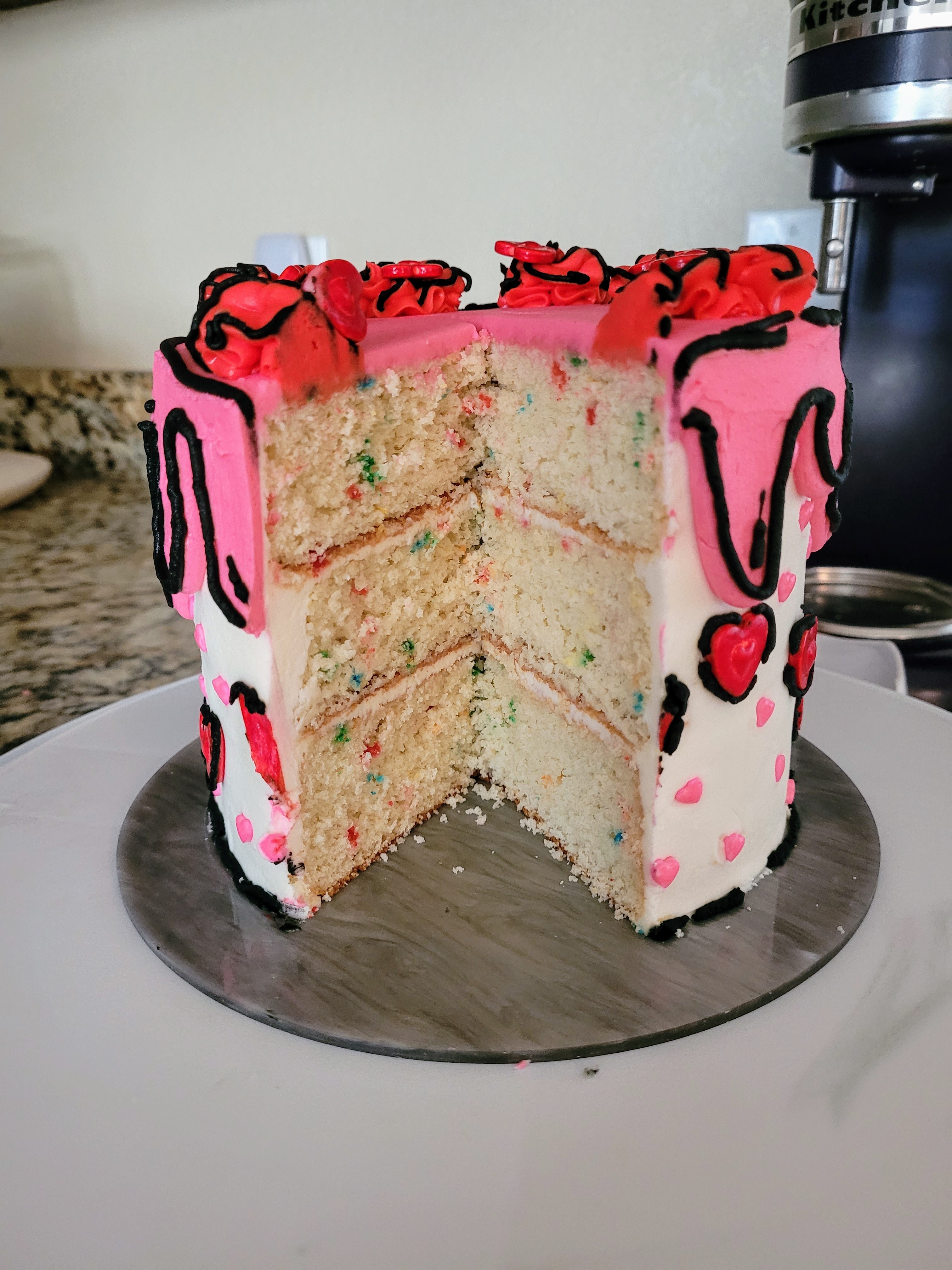 Okay, so the cartoon/comic-style cake trend was all over the place in November and December, and has slowed down since the holidays, so I am extremely late to this party. But a cake where you don’t have to worry about precision accuracy, the cleanest of lines, and the smoothest of frostings? I’m in. So I may be late, but bitter late than never. I thought it would be funny to make a lemon cake and design it as a Valentine’s cartoon cake style because I am a bitter human being that doesn’t actually celebrate the holiday (the chocolate and floral industry can’t pull one over on me)…so a sour-flavored cake just rings true to how I feel about Hallmark’s attempts to make me a romantic. Also, my lovely coworkers gifted me with ALL. THE. SPRINKLES. for my birthday, including a large set of V. Day sprinkles, so I figured this was a pretty good use for them. I may hate Valentine’s Day, but damned if I don’t love a good cake sprinkle more than anything else.