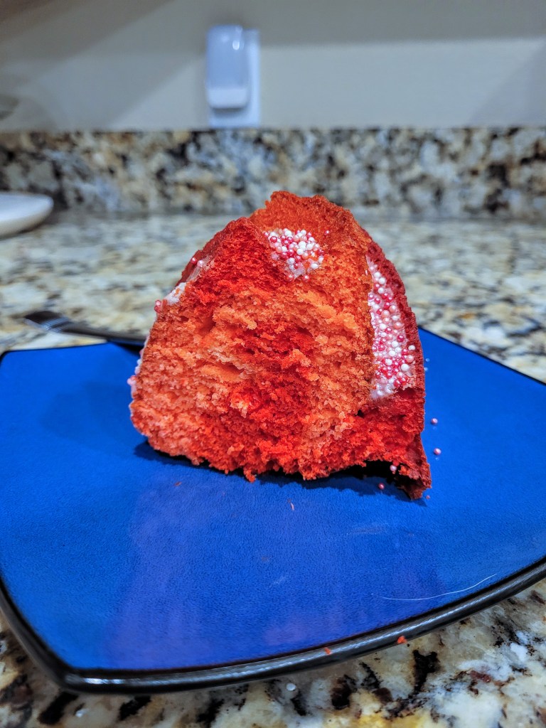 Looking for a cake to woo that special someone this Valentine’s Day? Or, more realistically, you just want to eat some cake but don’t want to spend the day in the kitchen making one? Yeah, I got you. This super simple raspberry bundt cake requires no pureeing of berries, no adding of various jams…you’ll be in and out of the kitchen in under an hour with a whole cake to call your own (or I guess, share, if you want to keep your Valentine happy). My mom bought me this amazing bundt pan for Christmas, and I’ve been dying to try it out. I was going for a two-toned look, but my red and pink dyes both got a lot darker while baking, so it just looks like a red cake until you cut into it. I recommend keeping half your batter white and dying the other half red to create more of a contrast for the two-toned look!