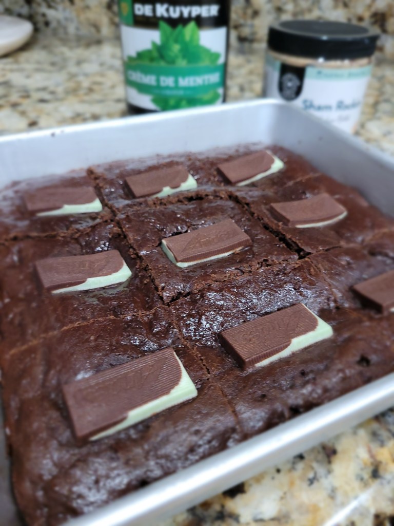 - Bake for 15 minutes, then remove from oven and gently place the 9 Andes mints on top of the batter.