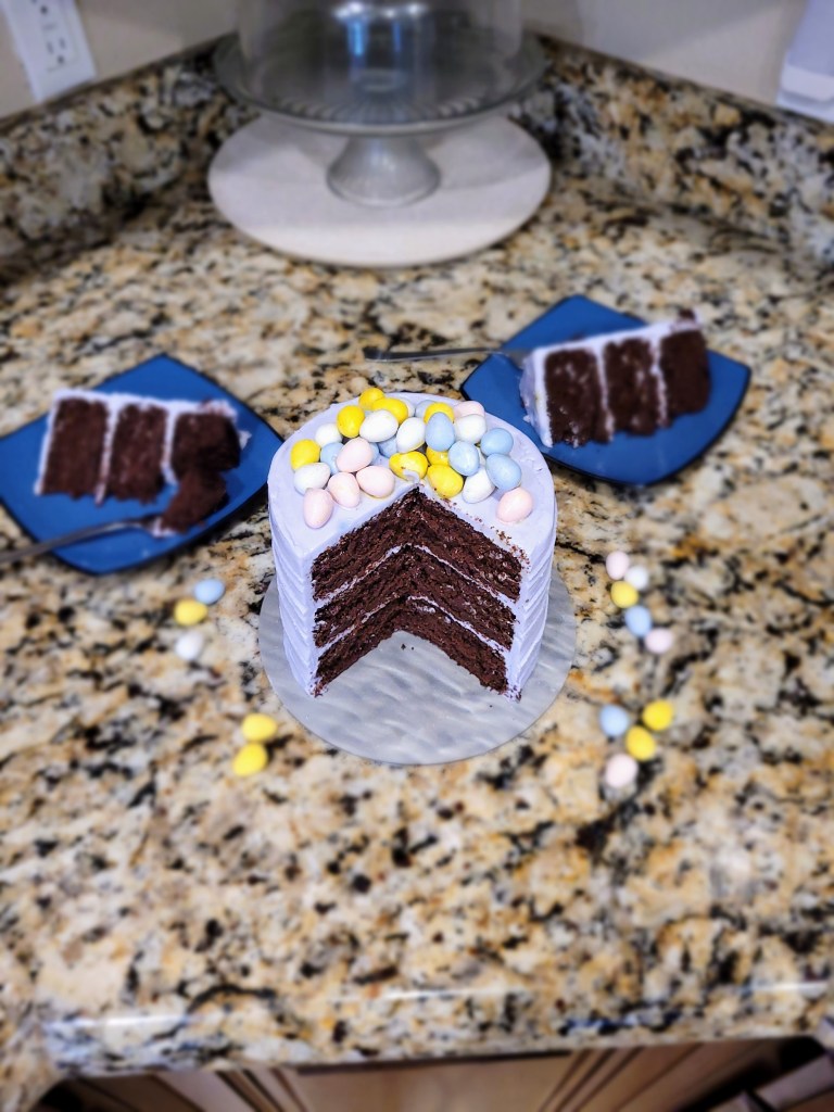 Get egg-cited!!! It’s Cadbury egg baking season! Y’all, mini Cadbury eggs are positively dangerous. It’s a 1-pound bag of M&M’s on flavor steroids, essentially. I knew I wanted to make a few recipes with these delicious little devils, and I figured what better way to start than with the world’s chocolatiest cake? No bunny better lay a finger on this baby; it’s so good, I refuse to share…you’ll just have to whip up your own. If you’re into incredibly tender and moist chocolate cake decadence, grab the details below, and hop to it! This is seriously the softest, most flavorful chocolate cake I’ve ever made without the help of Baileys…