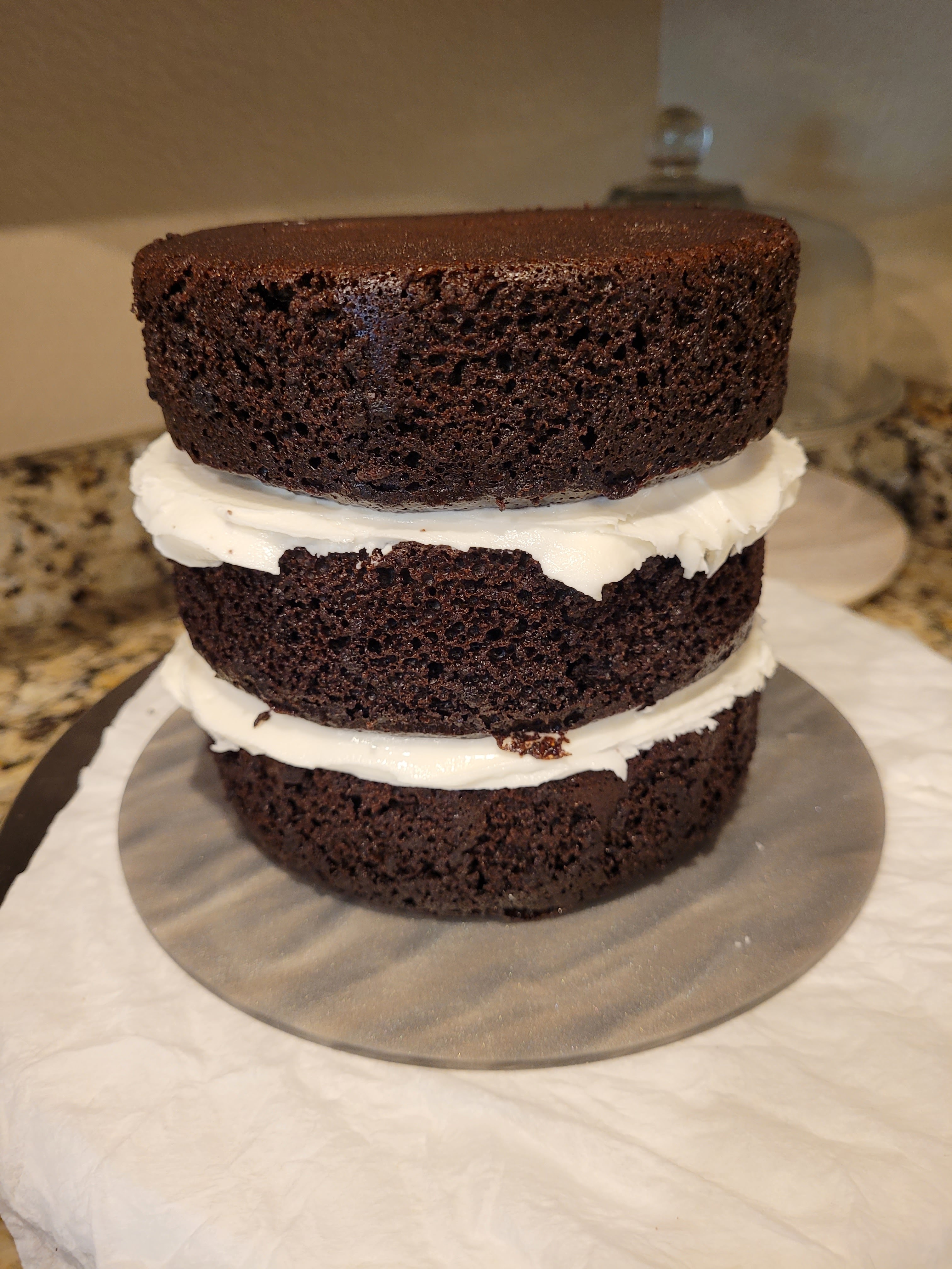 Whip the cream cheese and yogurt with a paddle attachment in your stand mixer until fluffy, about three minutes. Add in half the monkfruit, citric acid, one tablespoon of milk, and the extract. Blend well, then scrape the bowl before adding the remaining monkfruit and one more tablespoon of milk. To assemble, you just need to slather a layer of buttercream on top of a cooled cake layer, then add another layer (I always place them face down so the smooth surface on the bottom of the cake is now on top), then place the final layer on top. Smooth out any excess that pops out of the sides.