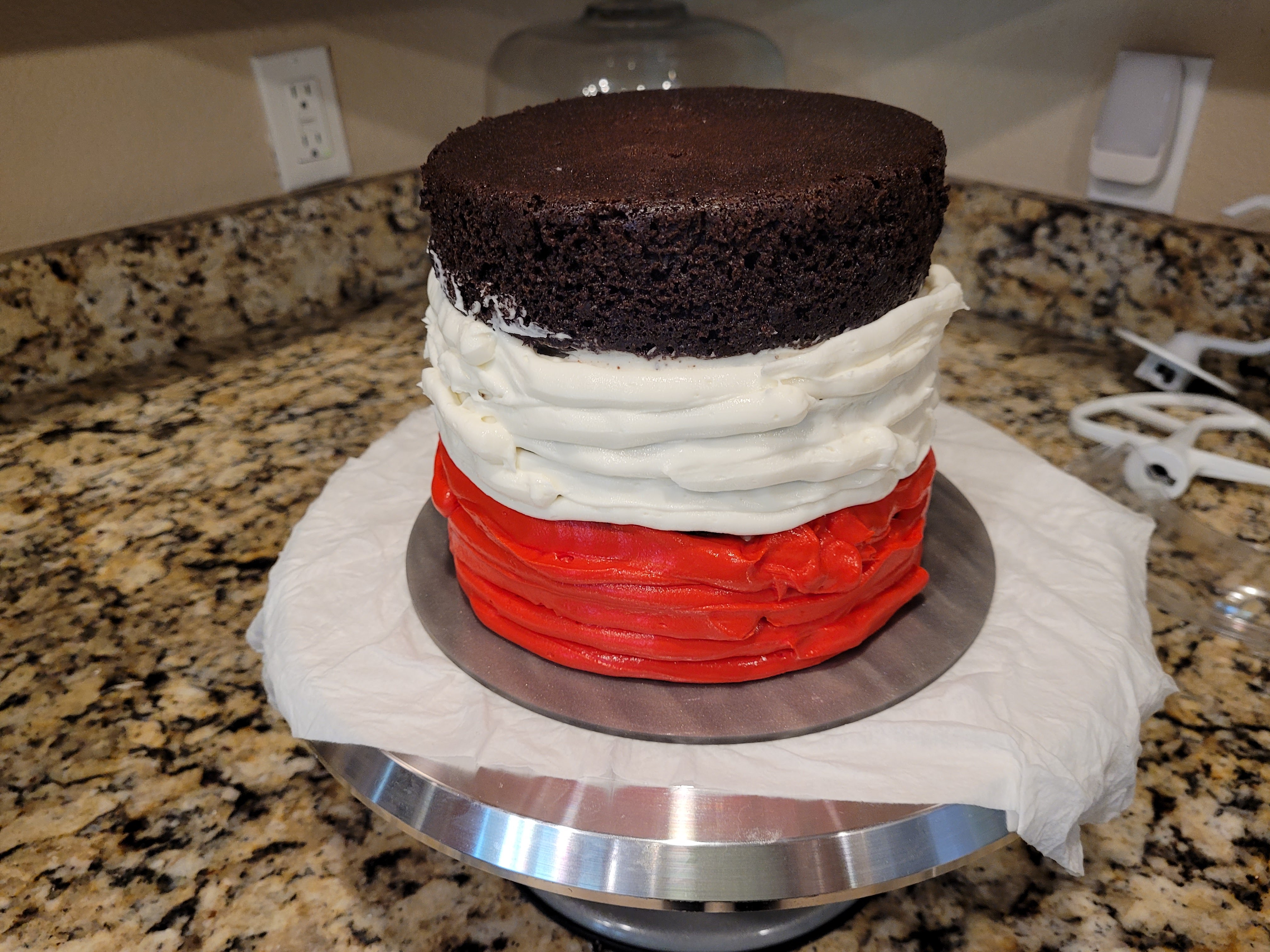 Now, divide your remaining frosting. Put a third of the plain white frosting into a piping bag and set aside. Split the remaining frosting into two bowls; dye one red and the other navy. Place each into their own piping bags as well; no tips needed. I wanted the top of the cake to be a dark night sky, so I started on the bottom of my cake with the bag filled with red frosting. I snipped the tip and drew red circles around the cake up to the end of the first layer of cake.