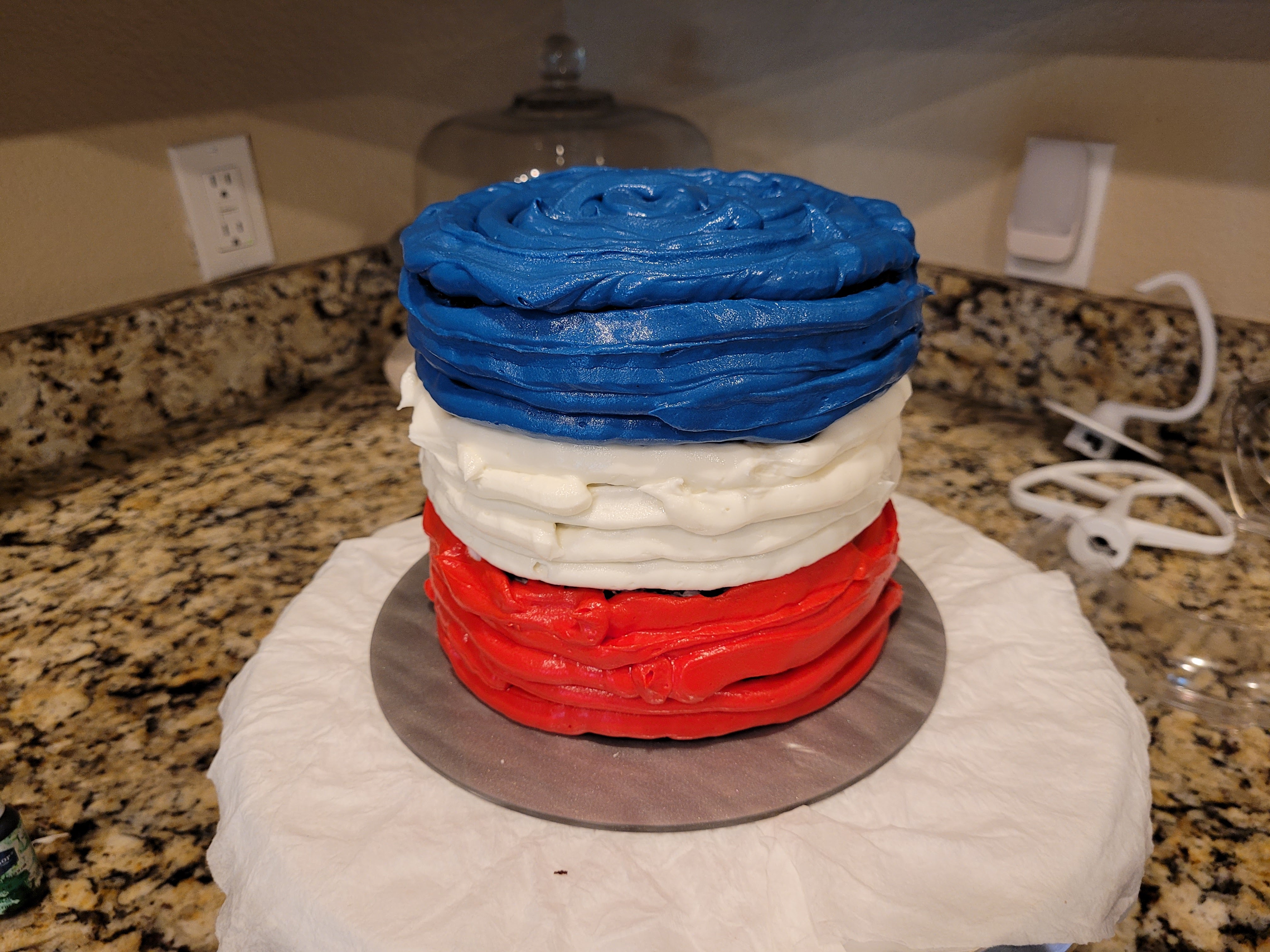 Simply make a pass around the cake with the scraper pressed closely to the side while turning the cake table. Once you’ve gone fully around the cake once, stop, and clean off your scraper. Make another pass, clean off the scraper again, and continue this process until you’ve smoothed out your frosting and your three color layers have come together. There will be a little bleeding onto the white, but it gives off a ~vintage vibe~ that our Founding Fathers would have probably been super into, so it’s all good. Now, place your cake in the freezer for 45-60 minutes. Once the frosting has firmed up a little, you can come in with a Viva paper towel pressed gently on the sides of the cake and use your hand to smooth any weird bumps. Repeat with a new towel each time you need to do this so more color doesn’t transfer. You can also do this on the top of the cake.