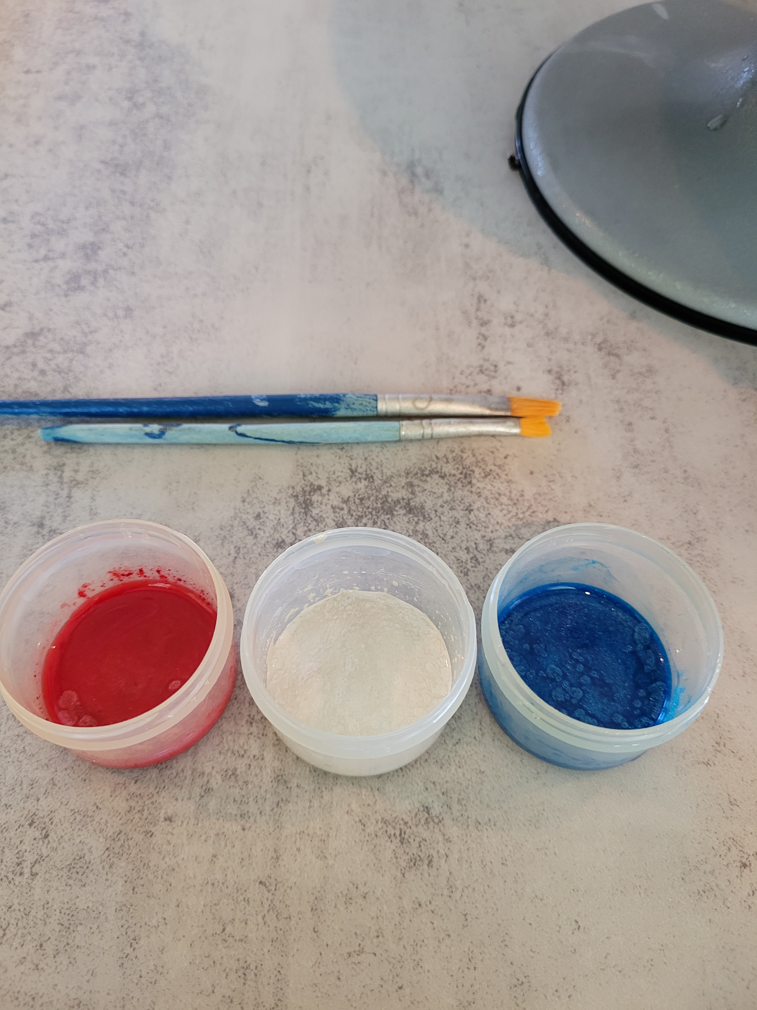 To paint the fireworks, you need to take 1/2 a teaspoon of luster in a small bowl (I have these little sauce-sized containers that were perfect), and then mix in 1/2 a teaspoon of clear vanilla extract; the mixture should be thick like syrup, so add more luster if needed. You can use any clear extract, really, just make sure the flavor compliments the frosting and cake. You can also use vodka (it evaporates), but in what I will now refer to as The Great Mystery of 2023, we somehow have not a drop of vodka to be found anywhere in this house, and I swear, I had nothing to do with it.