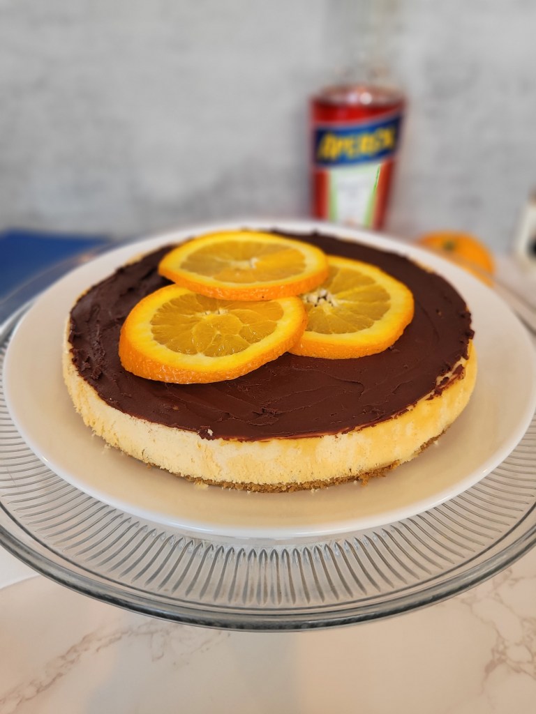 Light, citrusy cheesecake on a graham crust topped with Aperol chocolate ganache.