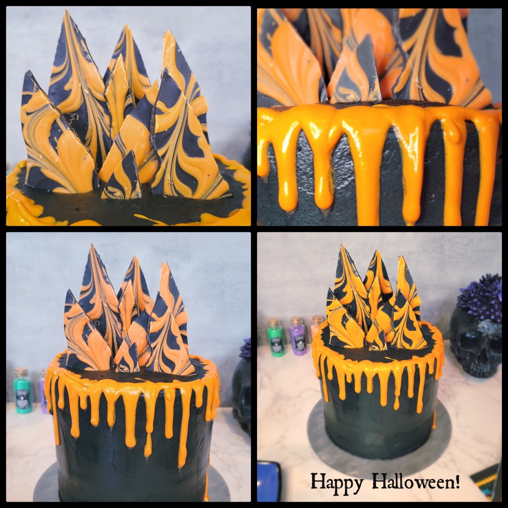 Once you’re done with the drip, just cut your chocolate bark (that would taste better if it were made of candy corn…) into triangles and stab ’em into the top of a cake in a way that would make Freddy, Jason, or Ghostface proud. Then your glittery black and orange beacon of Halloween is ready to scare (or feed) the masses! Bone appetit!