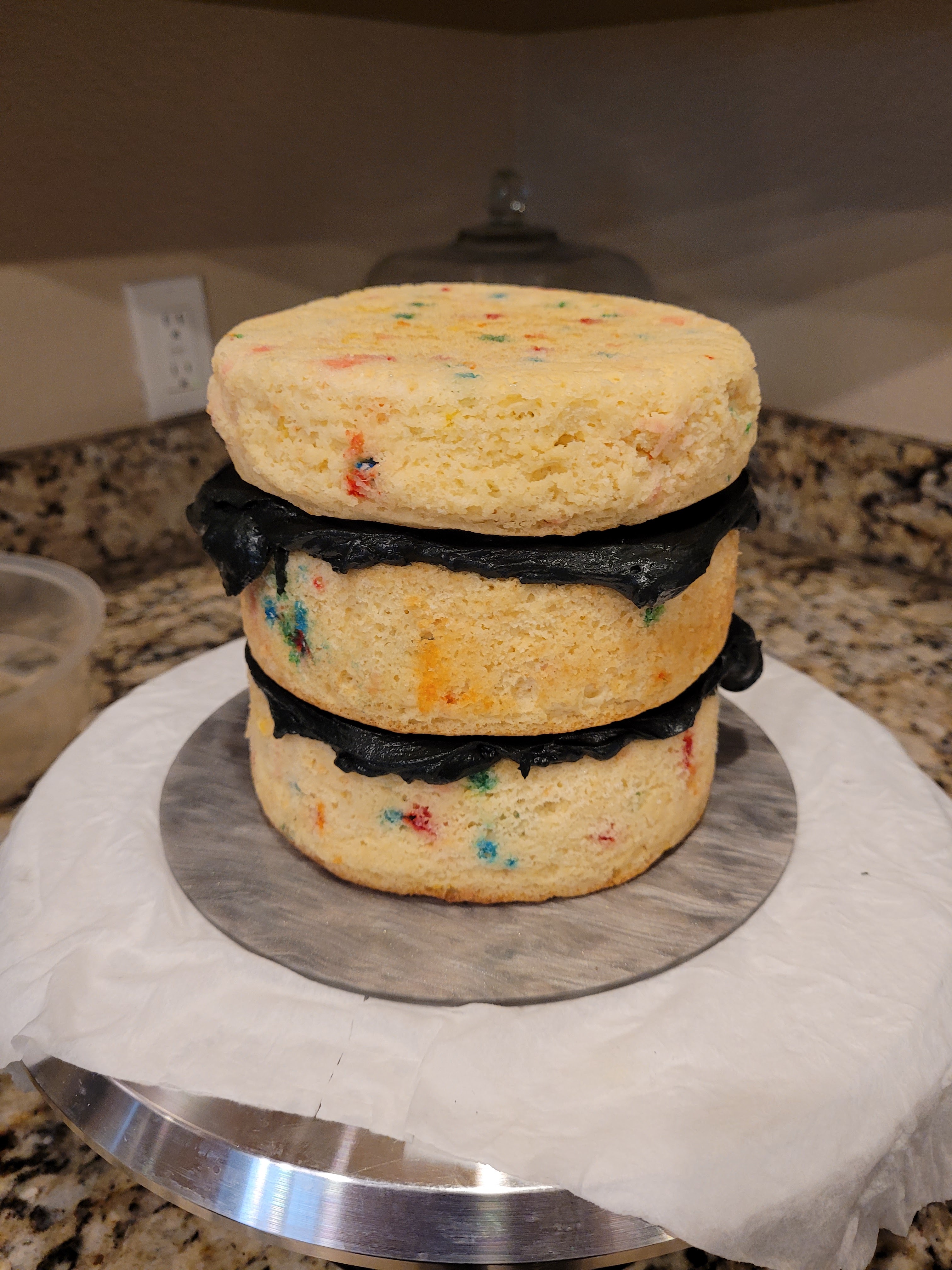 Take a cool cake layer on a cake board, face down, and top with a layer of frosting. Smooth out and repeat.