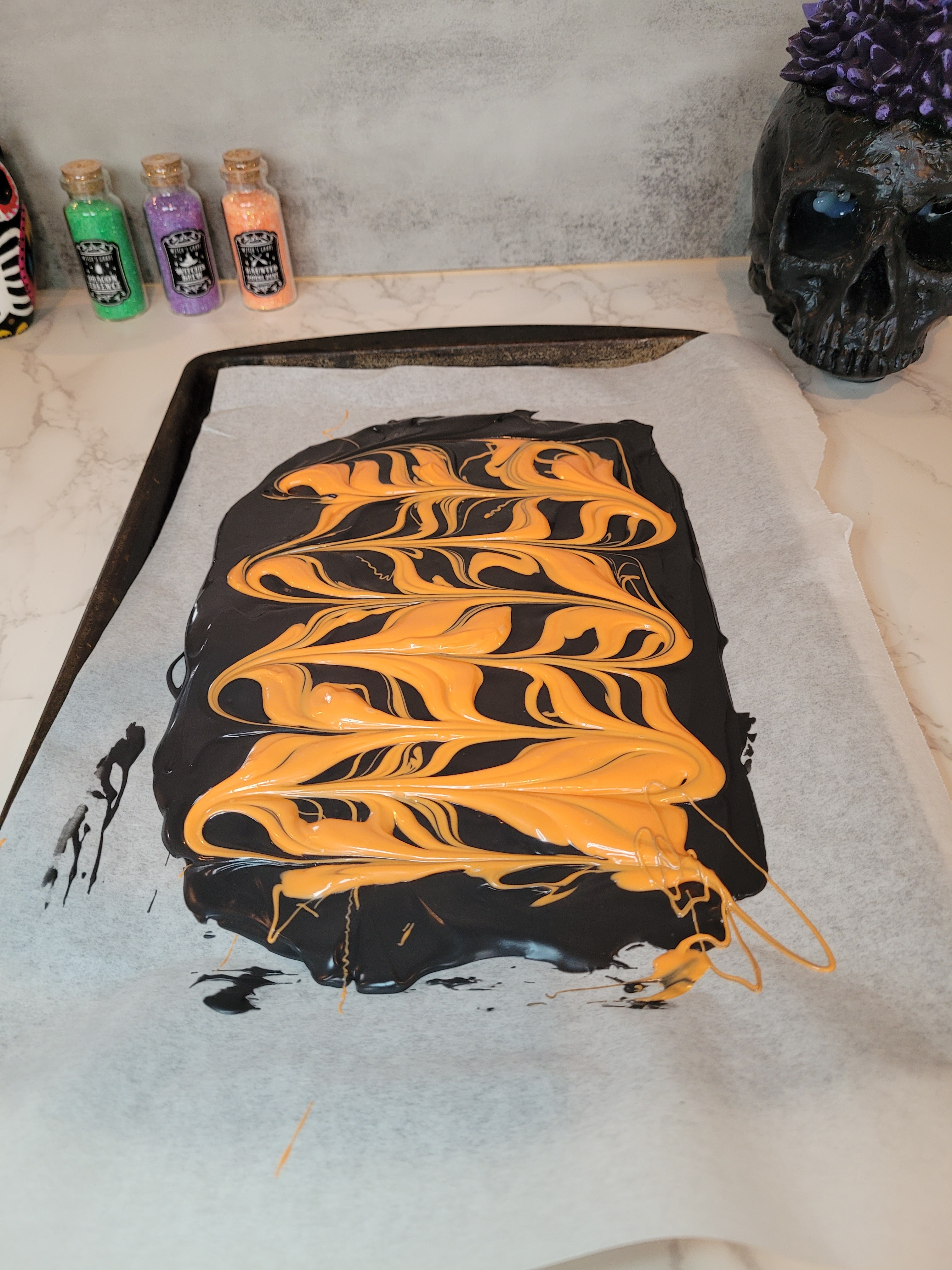 To make my bark (which you can watch above), I used half a bag of black chocolate melts and a quarter of a bag of orange chocolate melts, both melted according to package instructions. Working quickly, I smoothed the black chocolate onto a baking pan with Parchment paper into a rectangle. Then I dolloped orange on top of this and used a chopstick to create the swirled pattern.