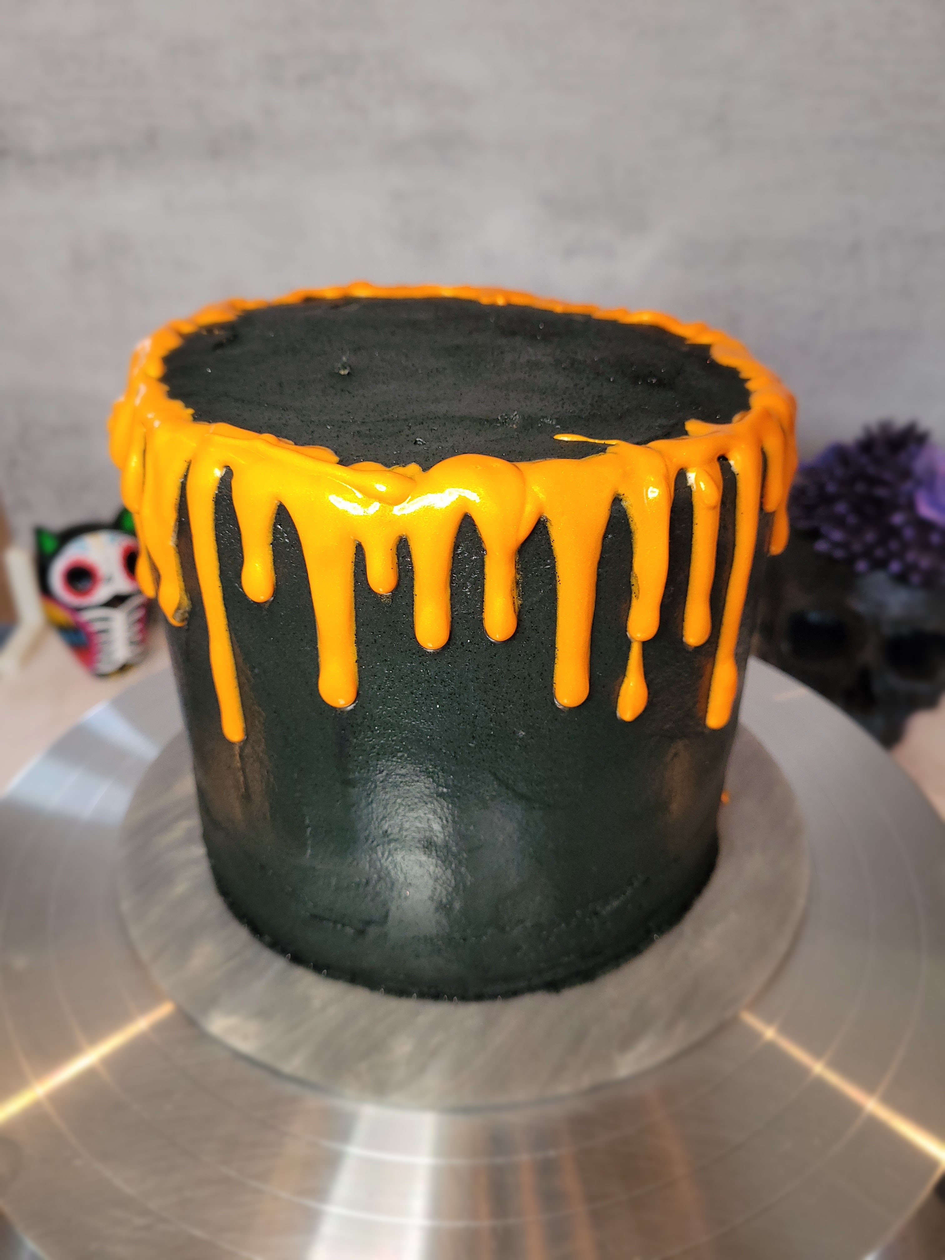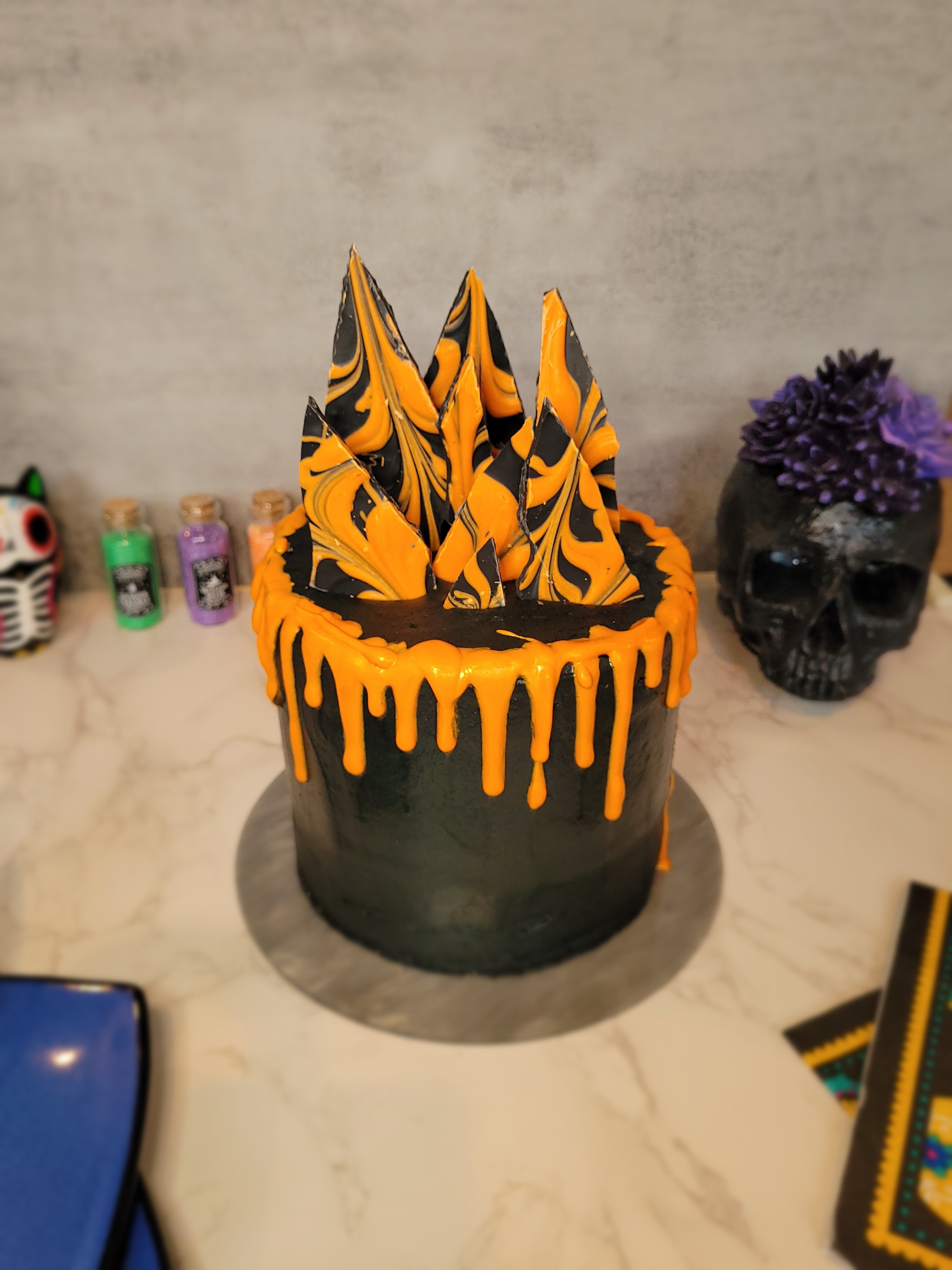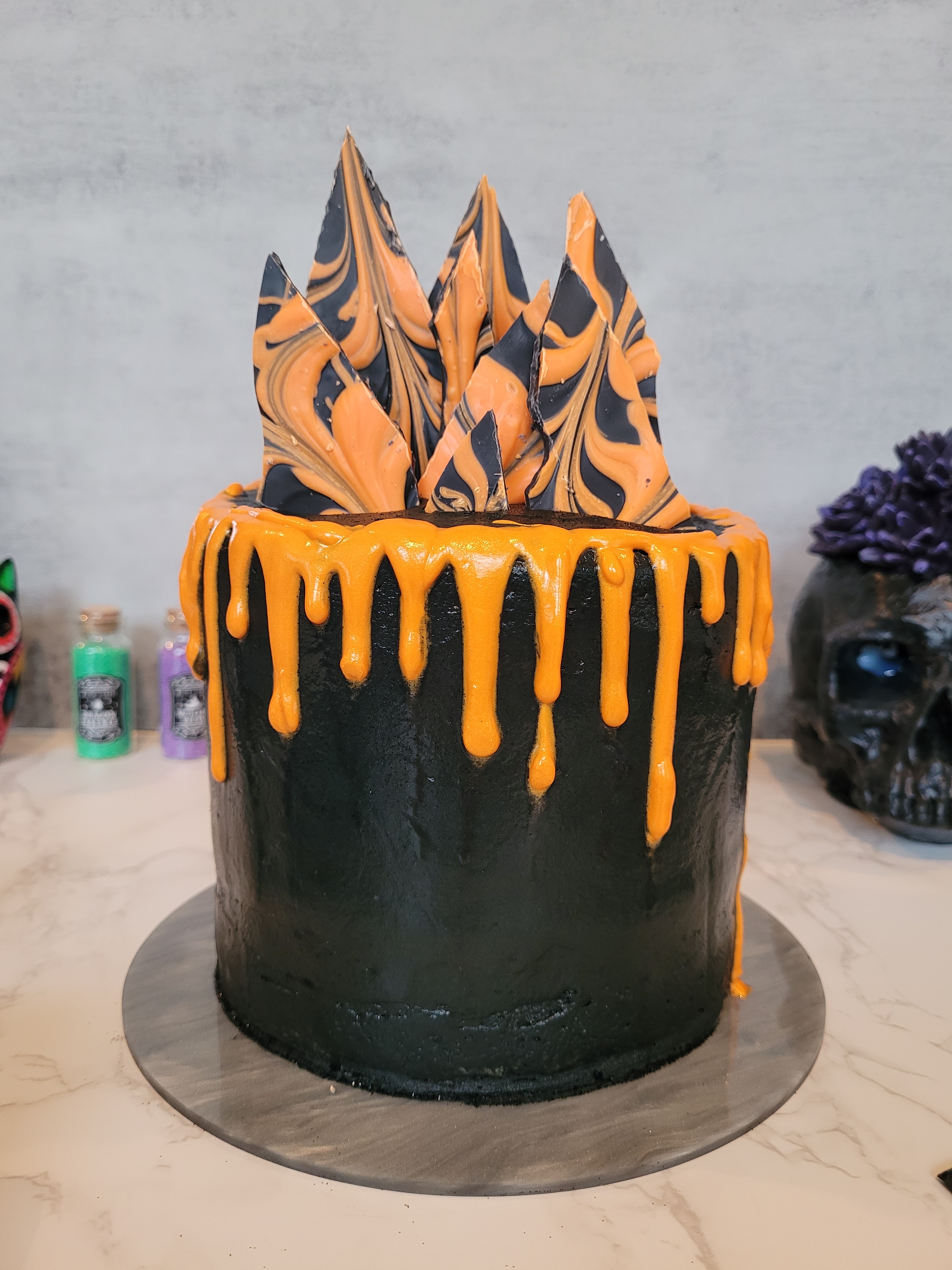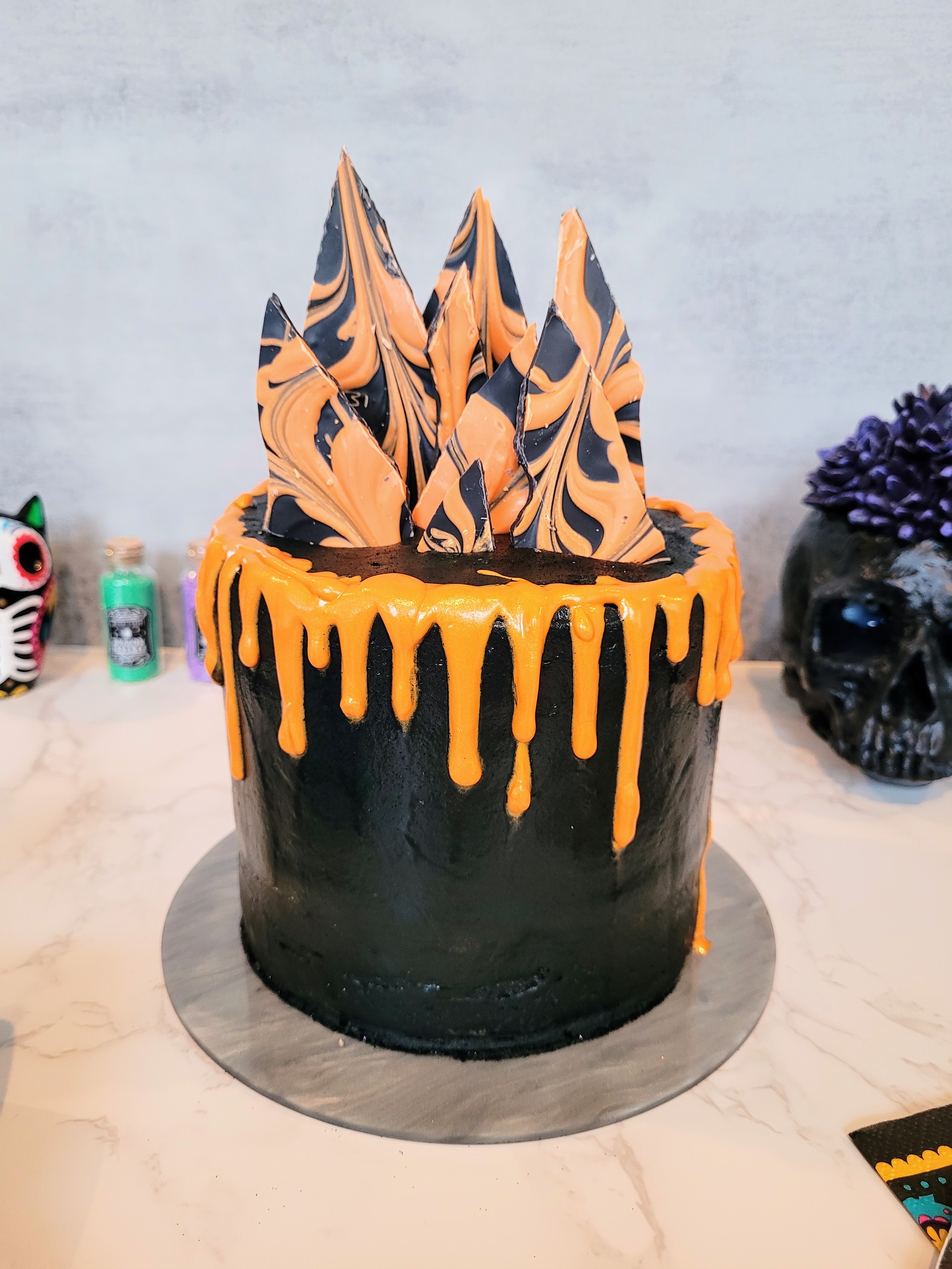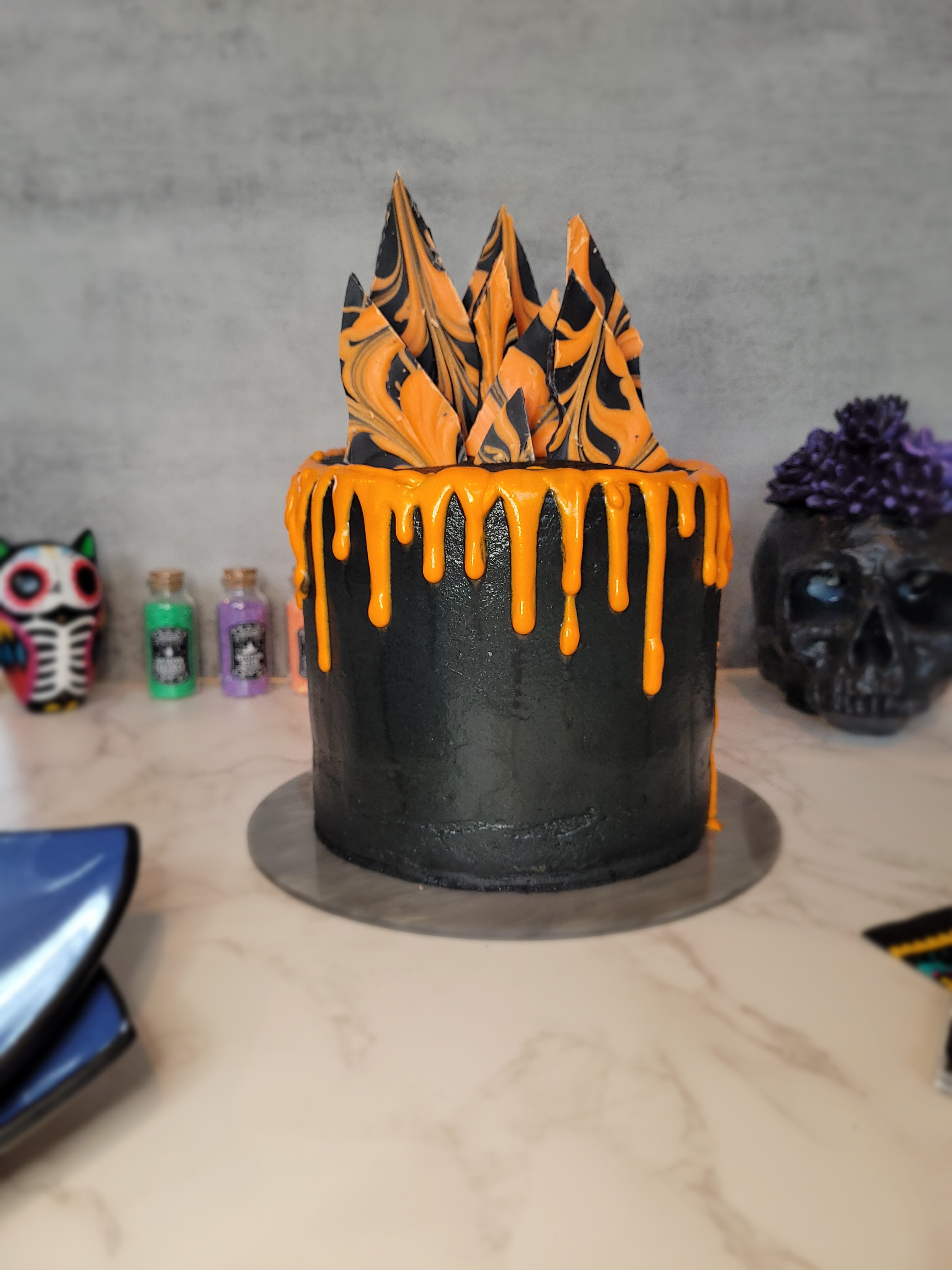 A ghoulishly delightful black and orange cake for Halloween celebrations.