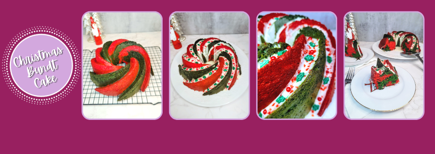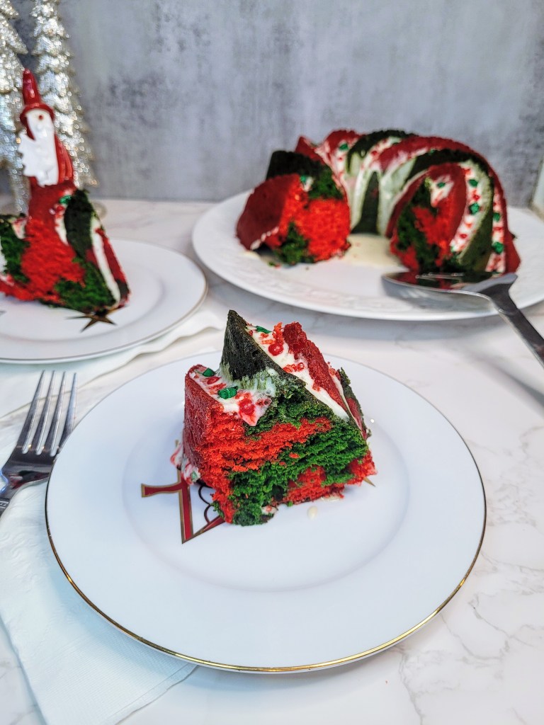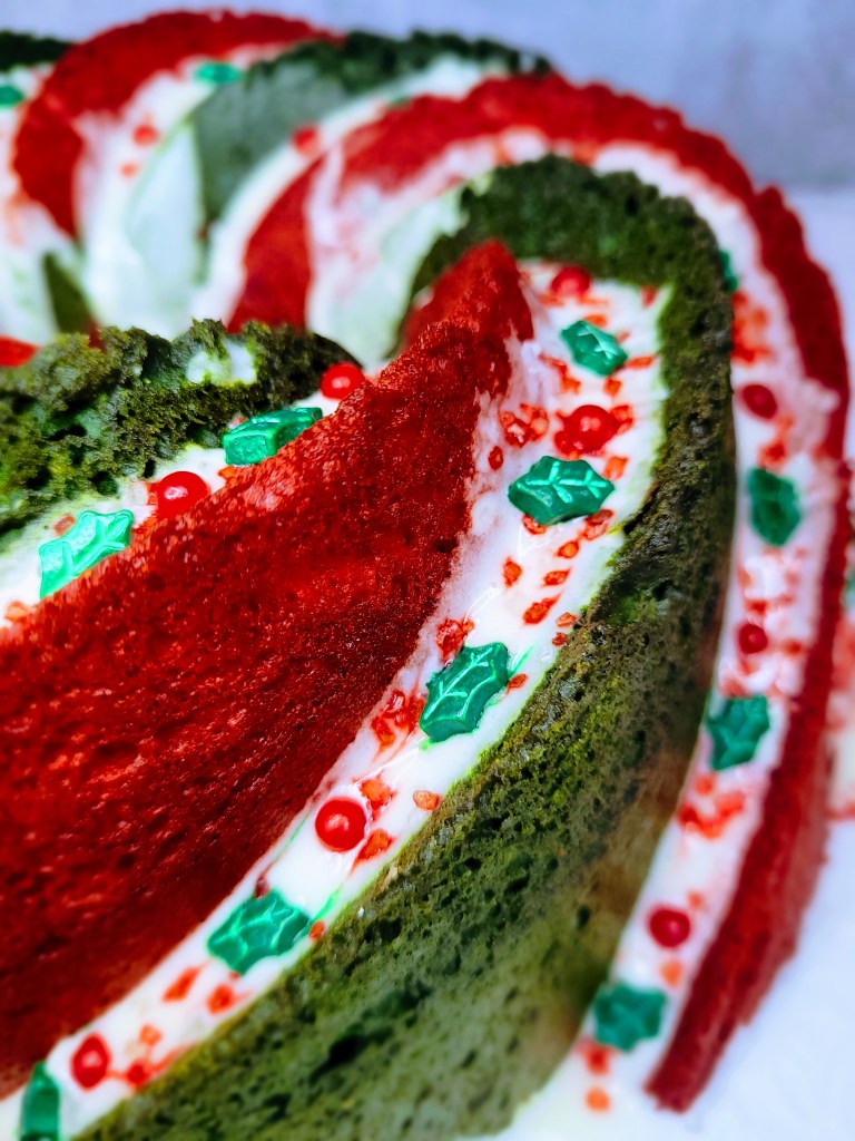 It’s a-bundt time to celebrate for Christmas, and this red and green peppermint cake is a super fun way to deck the halls. Sleigh dessert this season with the holly-est, jolly-est cake ever. You’ll want to use a bundt cake that is a little bit more geometric in design than a standard tube bundt pan; this is the one I have. Santa (a.k.a, my mom) put it under my Christmas tree last year, and I love baking with it to get these cool edges and make a two-toned cake. It is Claus-itively awesome.