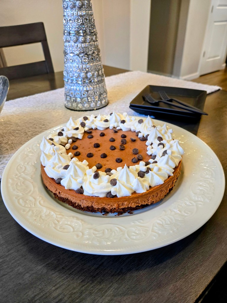 A peppermint and chocolate cheesecake on a mint chocolate crust topped with mini marshmallows and whipped cream