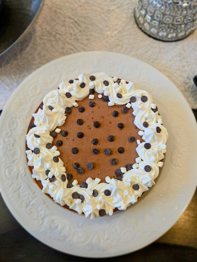 - Use a 1M piping tip to decorate stars and swirls around the cheesecake to make a border.