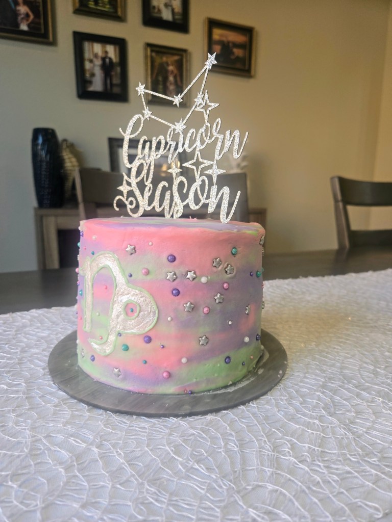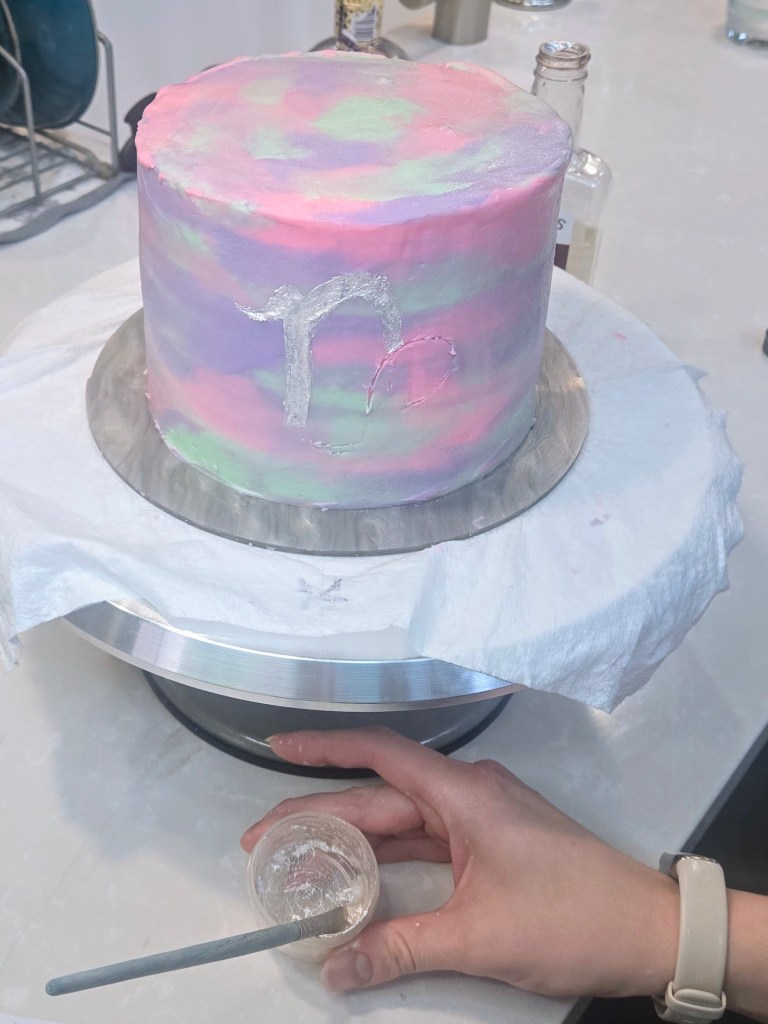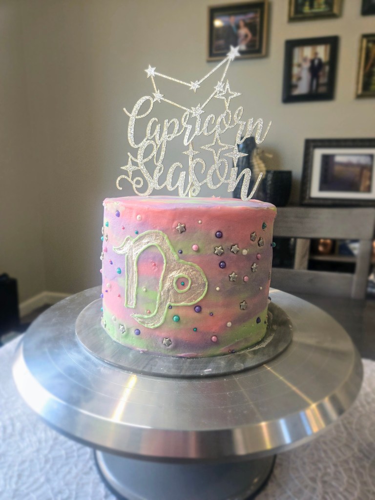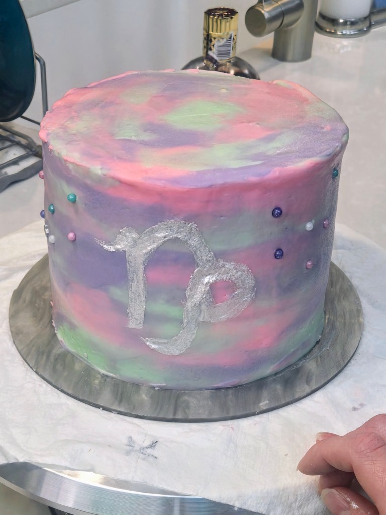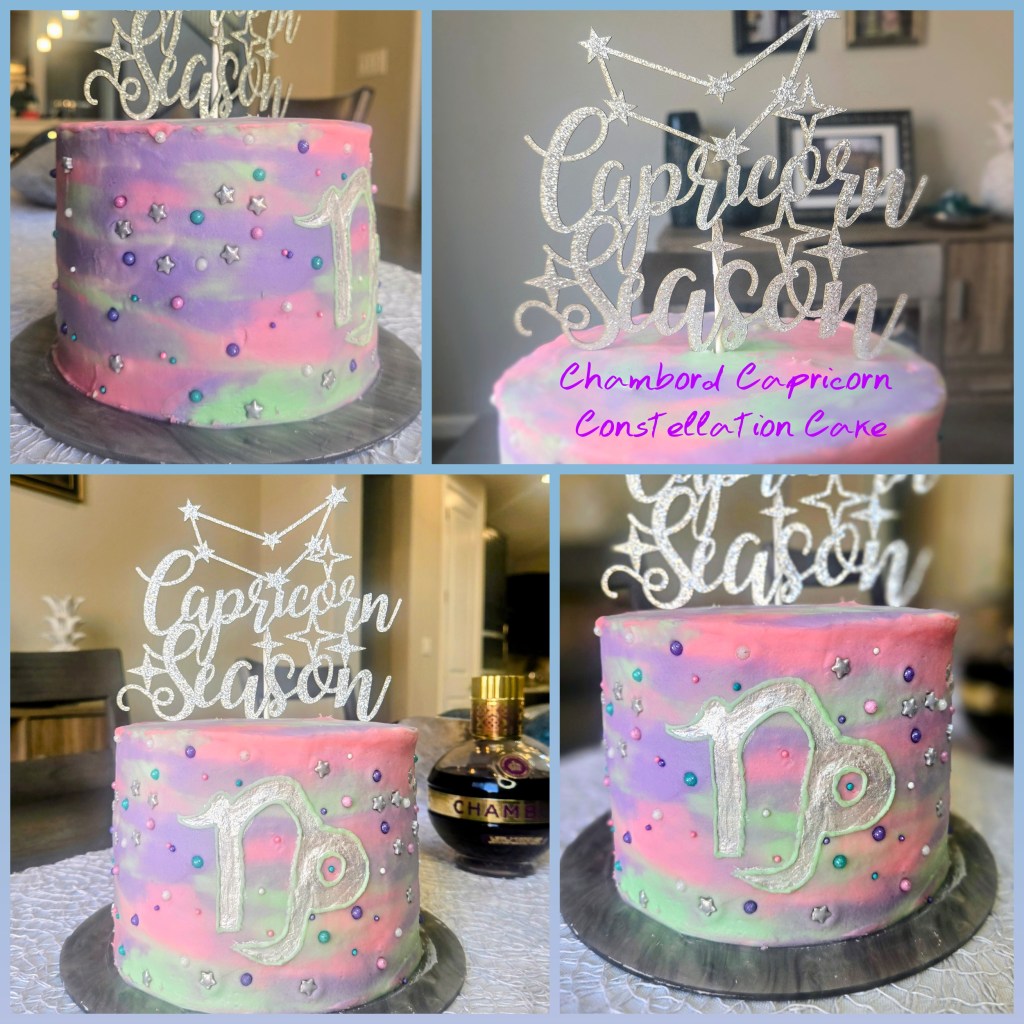 It’s my birthday today! To celebrate, I wanted a boozy cake that also screamed, “HI, I’M A CAPRICORN,” so I decided to make a Chambord-flavored cake (because us Caps love opulence, and a Chambord bottle is about as boujee and luxurious as it gets), but I also wanted to make a nebula-style cake that featured the constellation. I didn’t want to use bright, splashy colors because Capricorns are not bright, splashy people…we’re the ones behind the curtain making sure the show goes on. I wanted to use softer, more muted tones; you know, very mindful, very demure. I had to incorporate green in there since we are THE Cardinal Earth sign, so I went with a soft shade of mint complemented by light pink and regal purple. If you’re surprised someone as logical and rational as me is into astrology, that makes two of us.