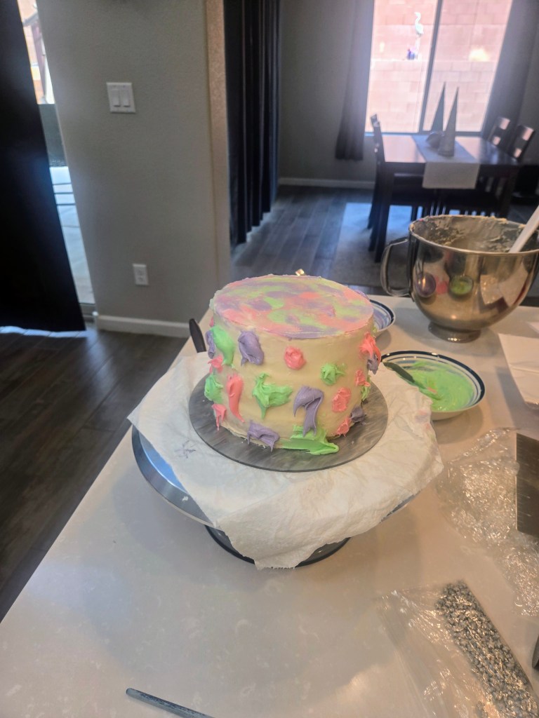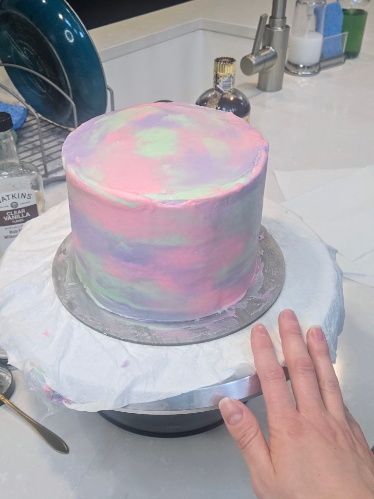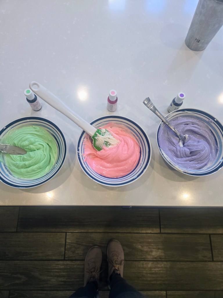 - You will need to crumb coat your cake in plain white frosting before dividing remaining frosting in three bowls: one mint, one soft pink, and one regal purple.