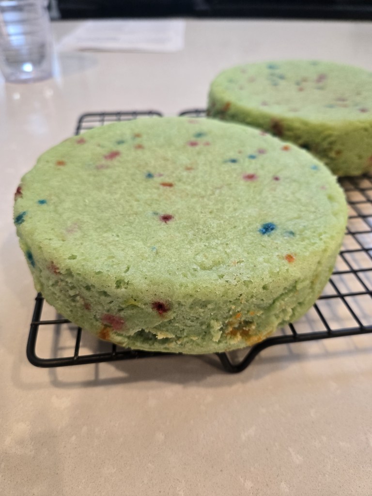 - Once fully cooled, frost your cake…you shouldn’t need any dye to begin with since the Creme de Menthe makes a lovely light green.