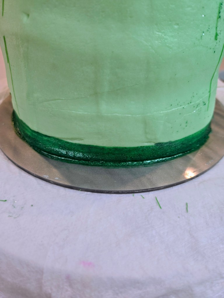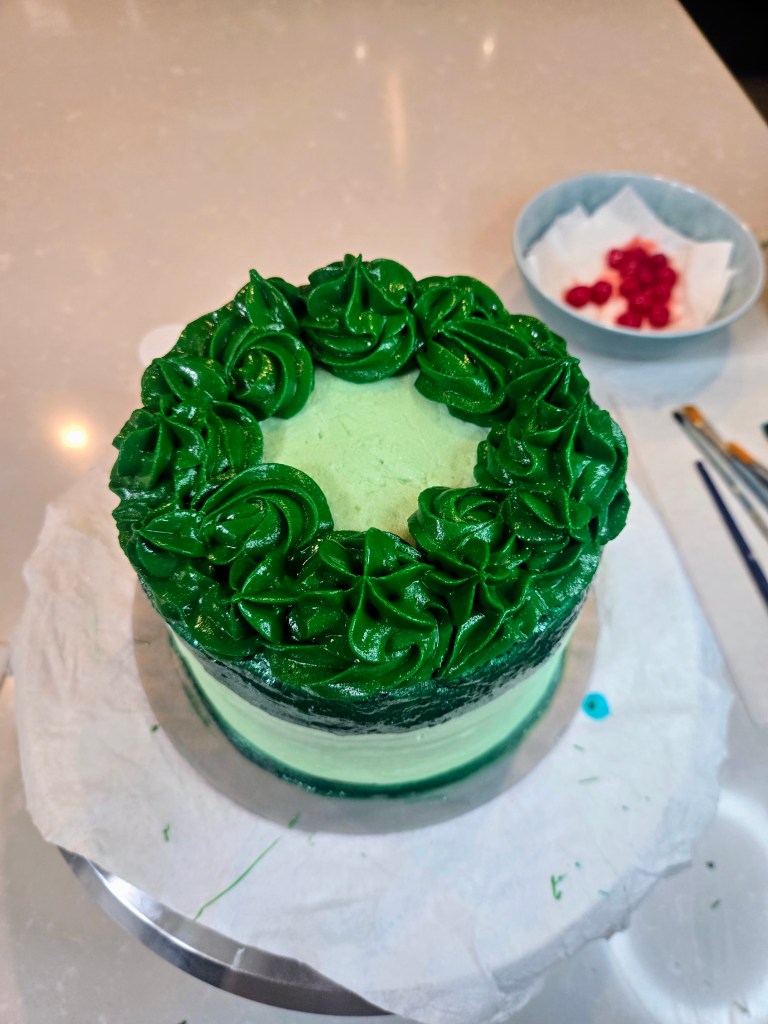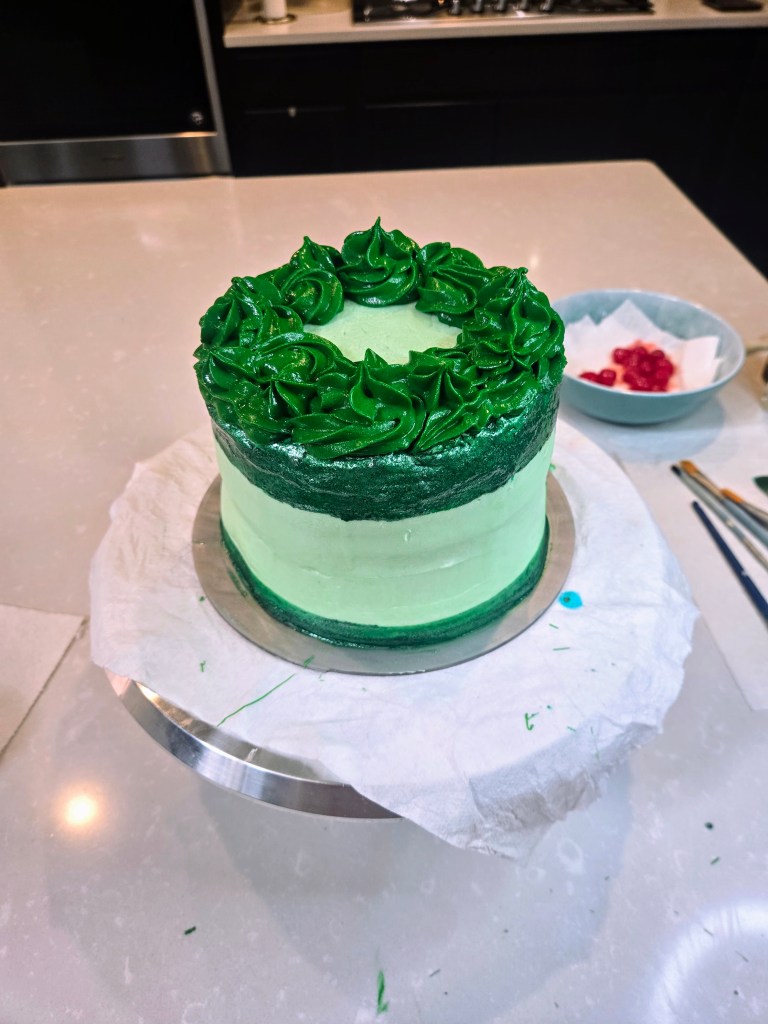 - Dye your remaining frosting with 1:3 ratio forest green to leaf green and load into a piping bag with 1M tip.