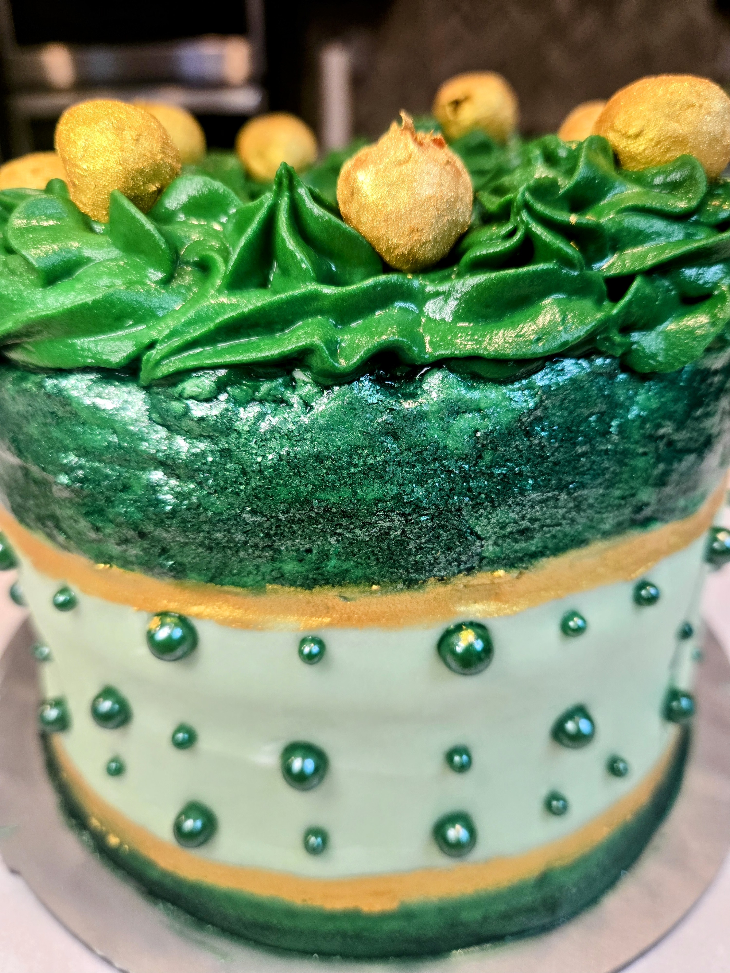 - I did alternating large green pearls to small pearls all around the cake, and sprinkled a few more on top in the middle of the cake where there was no piping.