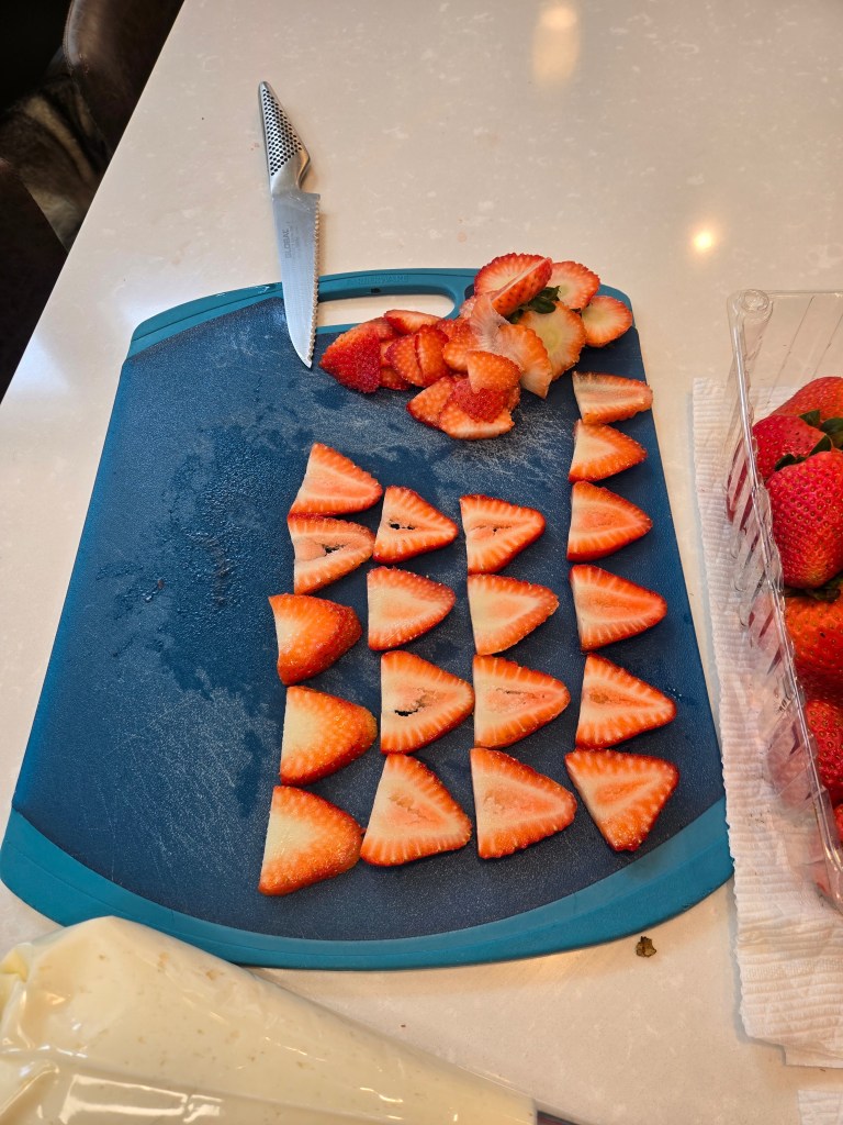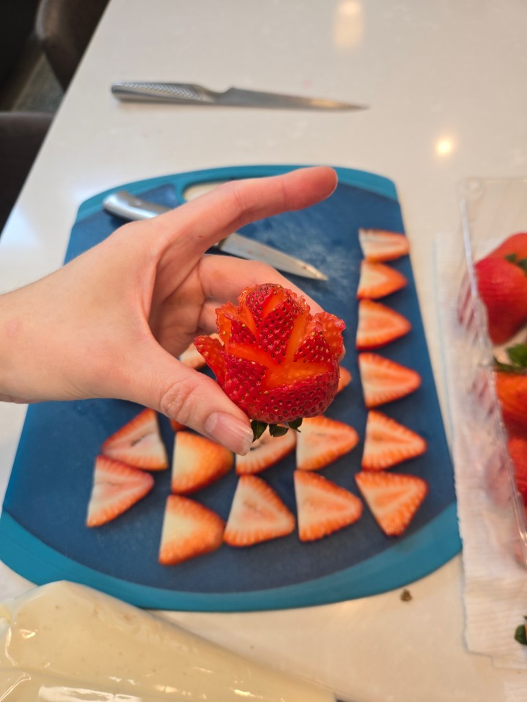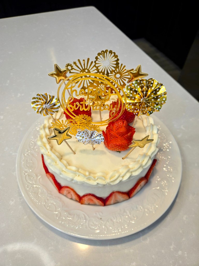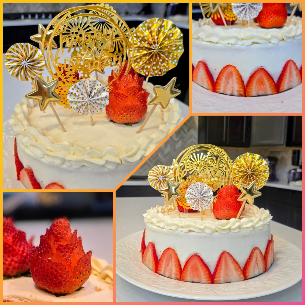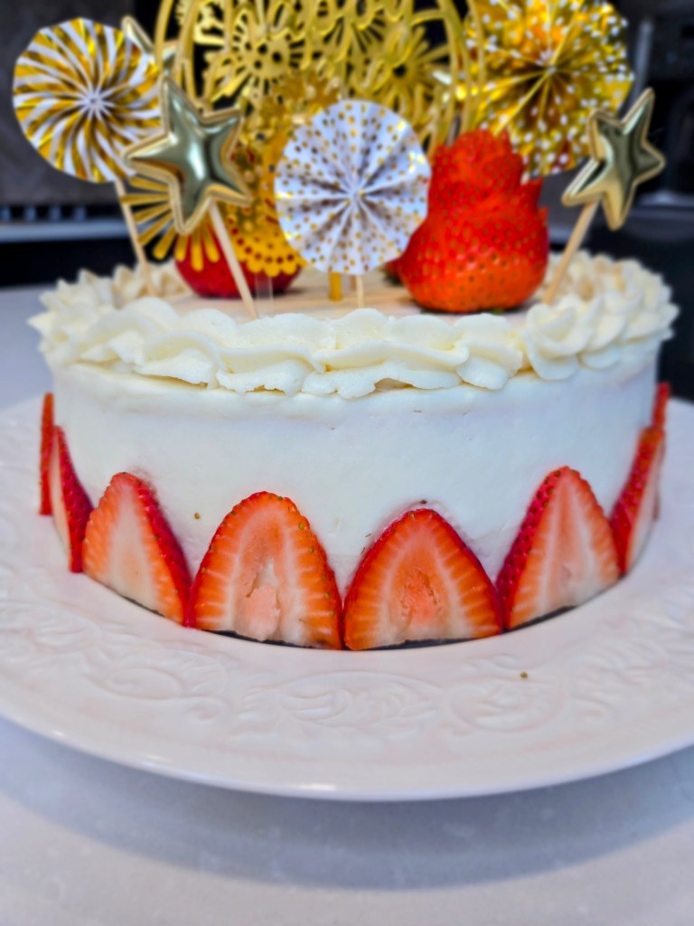 When two birthdays roll around in the same week, you berry well pull out all the stops–especially when it’s for your husband and your lovely mother-in-law! With our in-laws in town, it felt like the perfect excuse to revisit (and seriously glow-up) my strawberry cake recipe from earlier this month (you can tell I take my taste-testing seriously). I gave it the full birthday treatment: gold cake toppers, extra glam, and roses cut straight from strawberries…because nothing says “I love you” like hand-carved fruit flowers, right (as long as the chef doesn’t prick their finger on said carving knife)? Sweet, fresh, and made with lots of care (and buttercream), it was a delicious way to celebrate two very special people in our lives, because you can’t spell “family” without cake…or at least that’s what I tell myself.