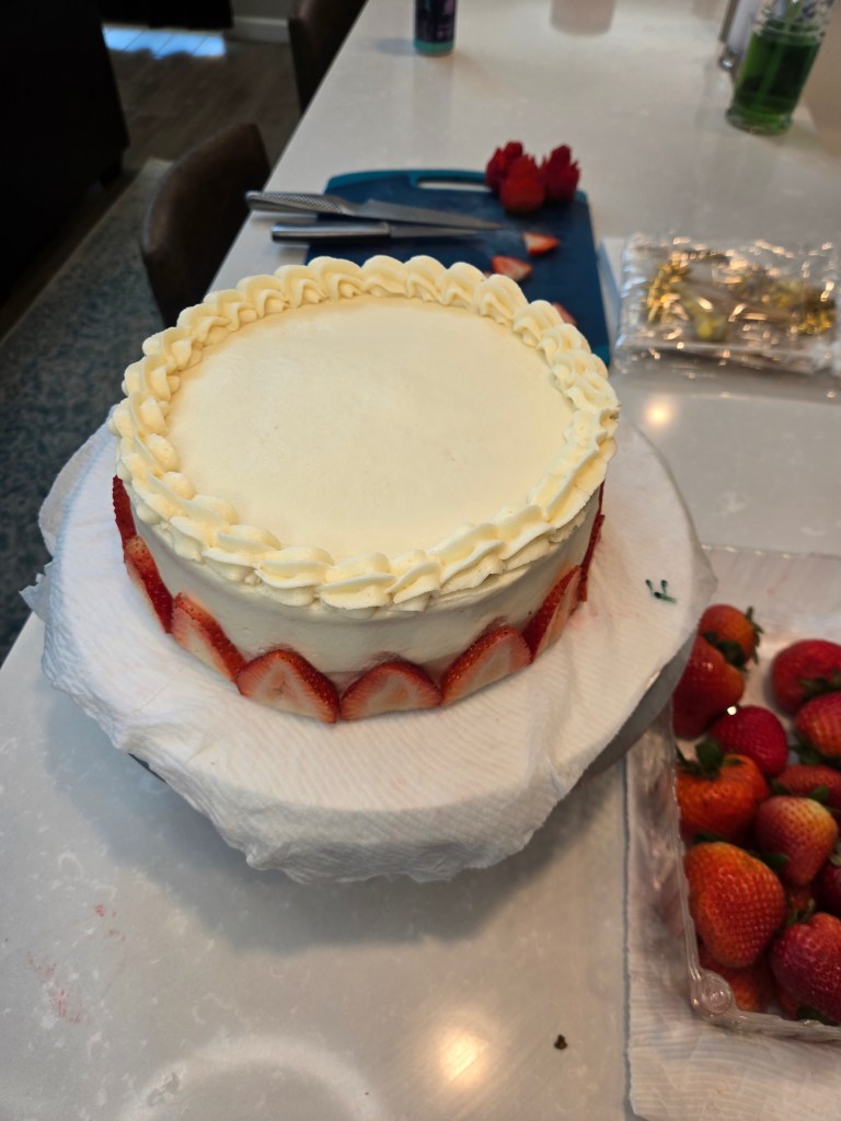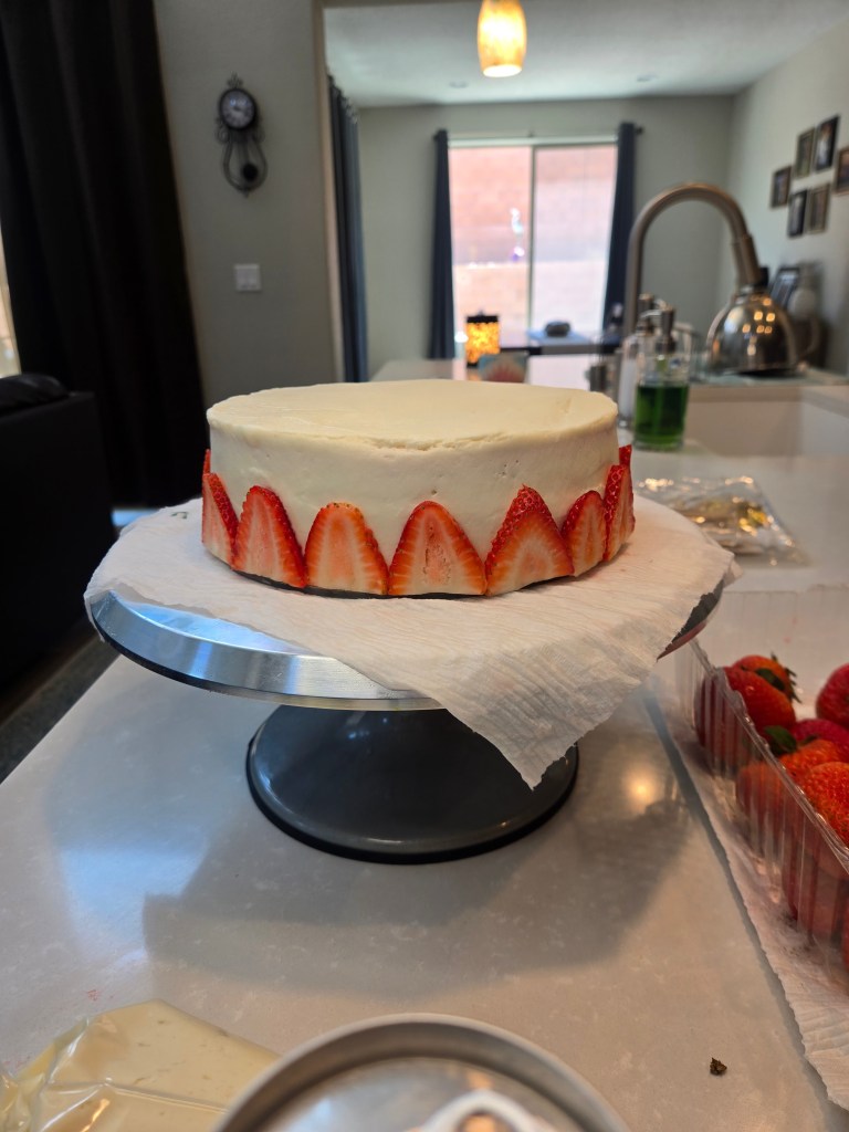 - Once fully cooled, frost your cake and place sliced strawberries around the bottom.