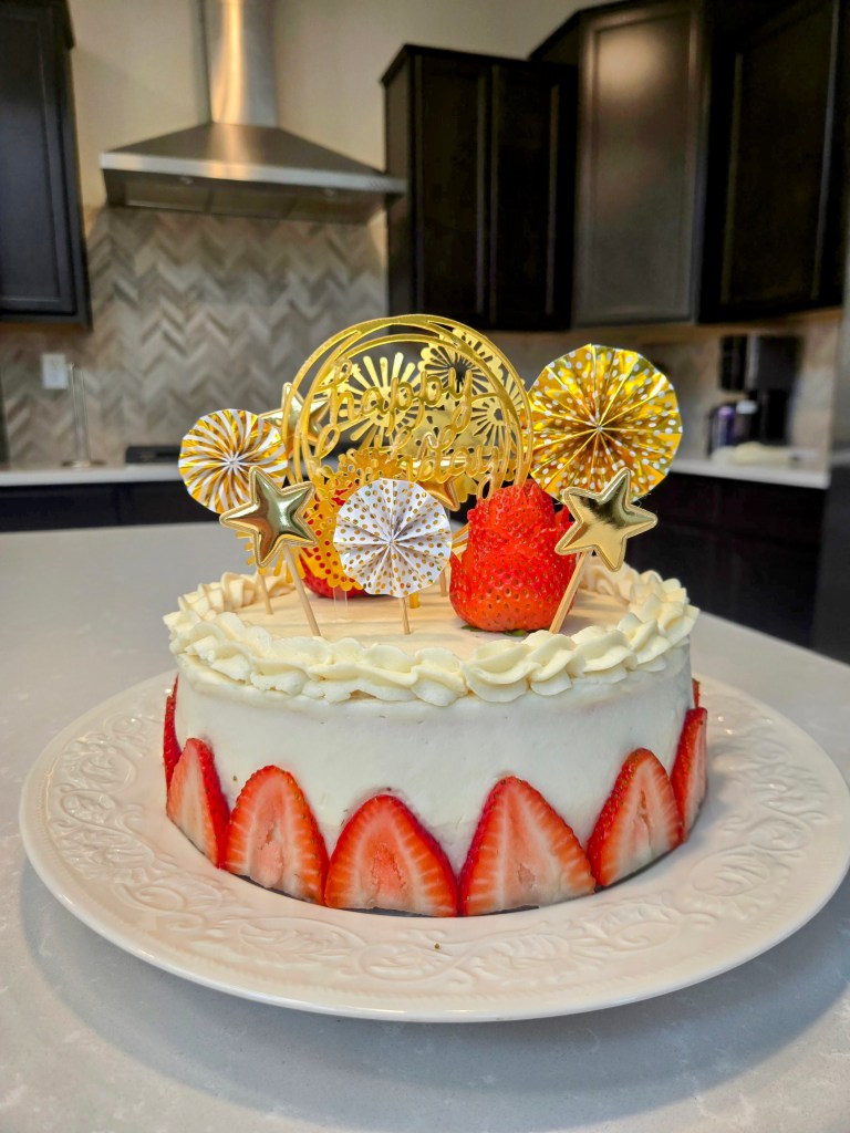 Since this was no ordinary celebration, I gave my original recipe a little birthday glow-up. I dialed up the strawberry flavor with a touch more extract in the batter (because more berry = more merry), and I added real butter instead of Greek yogurt to the frosting for that extra indulgence–a little buttery sunshine to balance the sweet. For the finishing touches, I used minimal piping and went full-on fruit florist: I sliced strawberries into delicate little rose shapes that turned out unbeleafably cute and a strawberry border. Add a few gold cake toppers, some edible sparkle, and boom: birthday magic, no fondant fuss required.