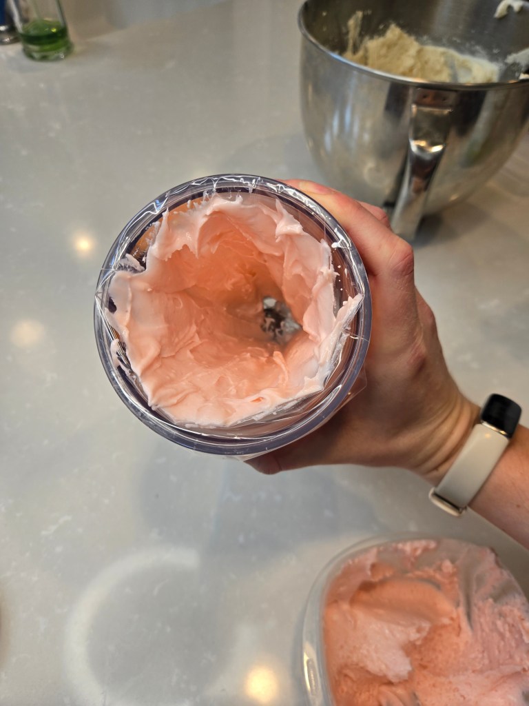 - Take a small amount of frosting out of the mixing bowl and put into a medium bowl; dye this light pink, and set remaining frosting in the mixing bowl aside.