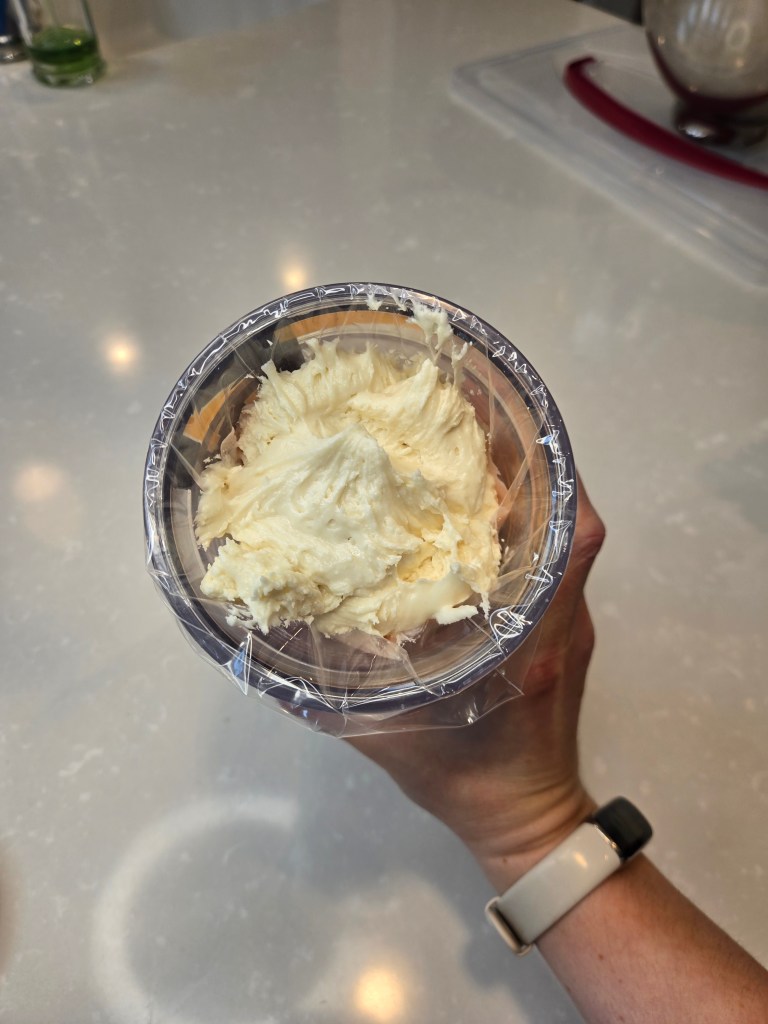 - To make frosting, whisk cream cheese and butter for 3 minutes before adding in half the powdered monkfruit, extract, citric acid, and Baileys.