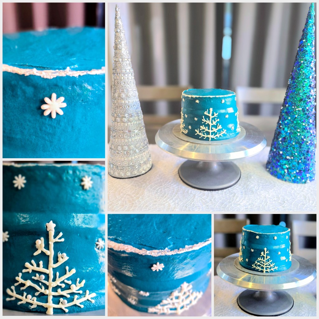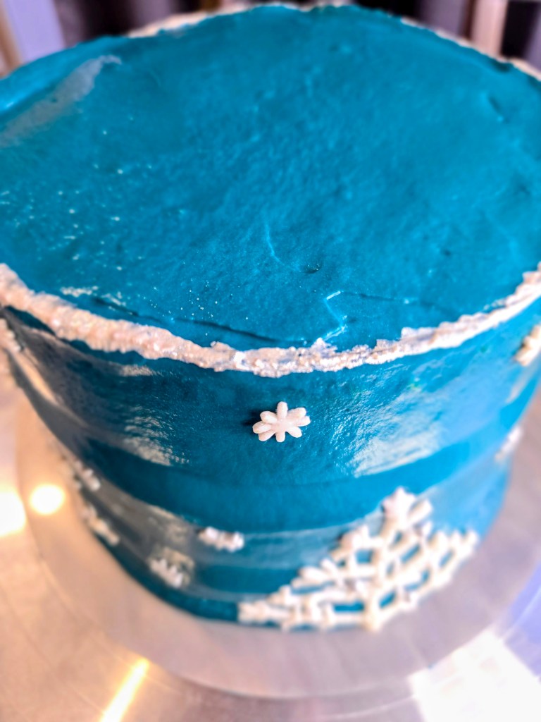 To bring this chilly masterpiece to life, you’ll need your favorite cake recipe, plenty of buttercream, a few piping tips, some sprinkles or mini ornaments, and a little edible silver paint for that frosty finishing touch. And since I absolutely did not take a single video like a responsible baking blogger, you’ll be following along with my extremely chaotic, but somehow still helpful, photo collage. Don’t worry: the pictures may be questionable, but the instructions will guide you through every snowy swirl and sparkly detail. Let’s frost this thing!
