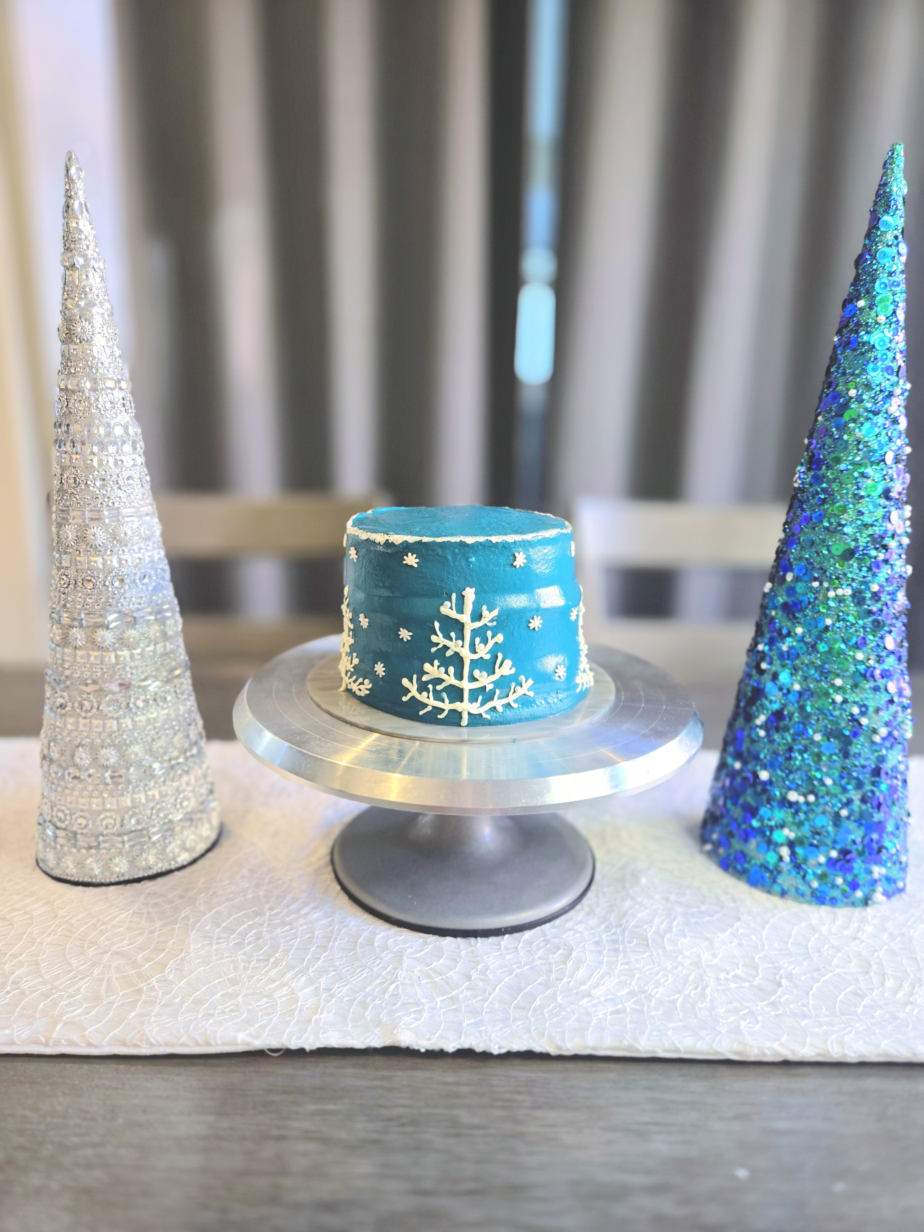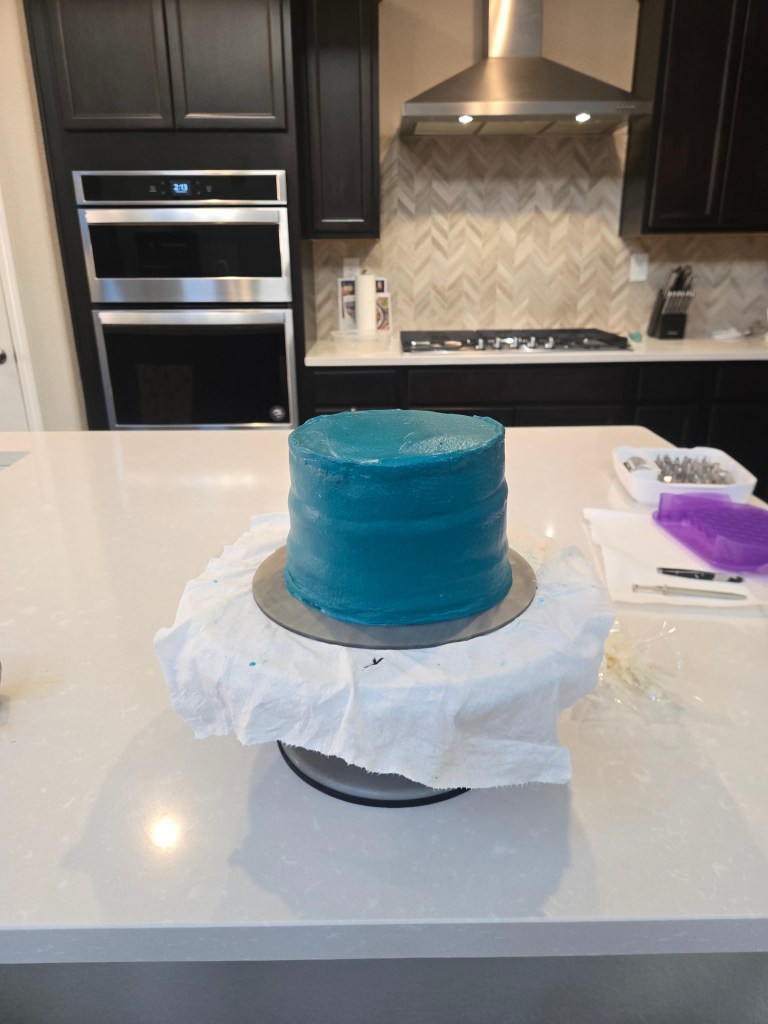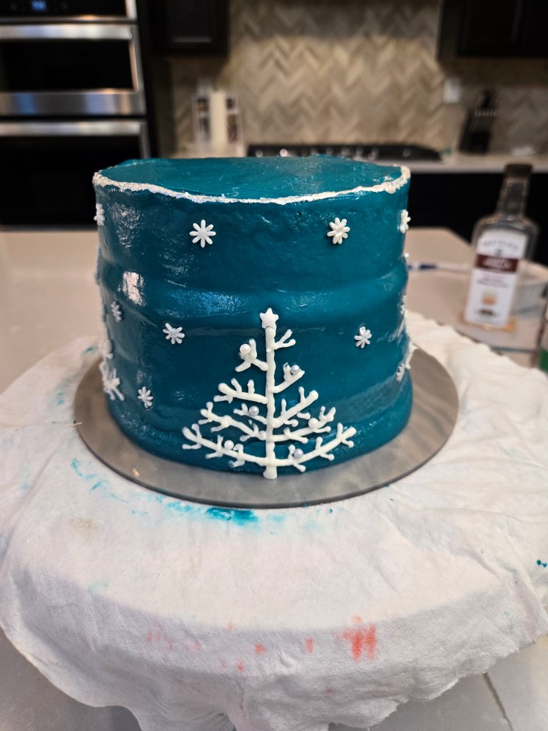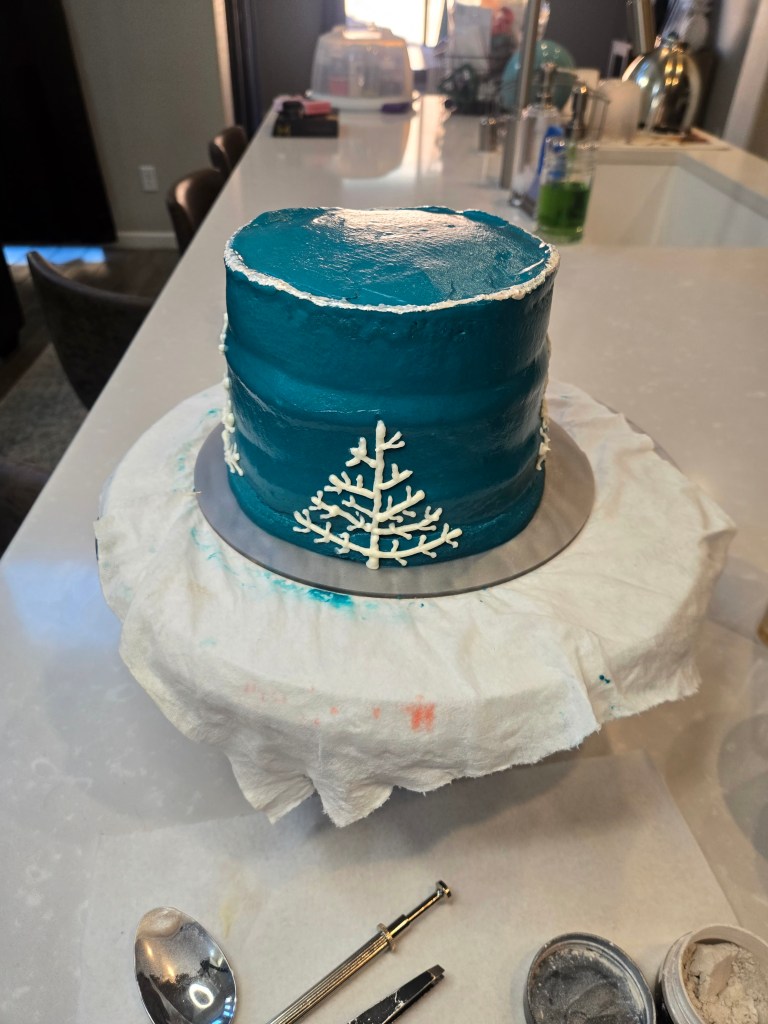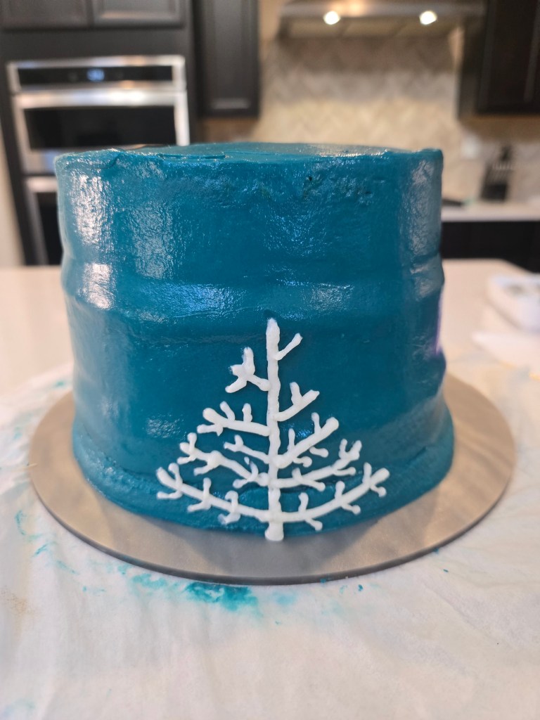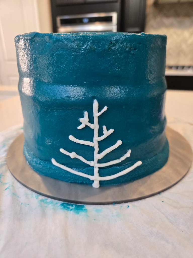 - While your cakes cool, you can split your frosting up so you have a small amount of white for the trees; and dye the rest dark teal by using 1 drop of black gel dye, 4 drops of navy, and a ridiculous amount of bright teal.