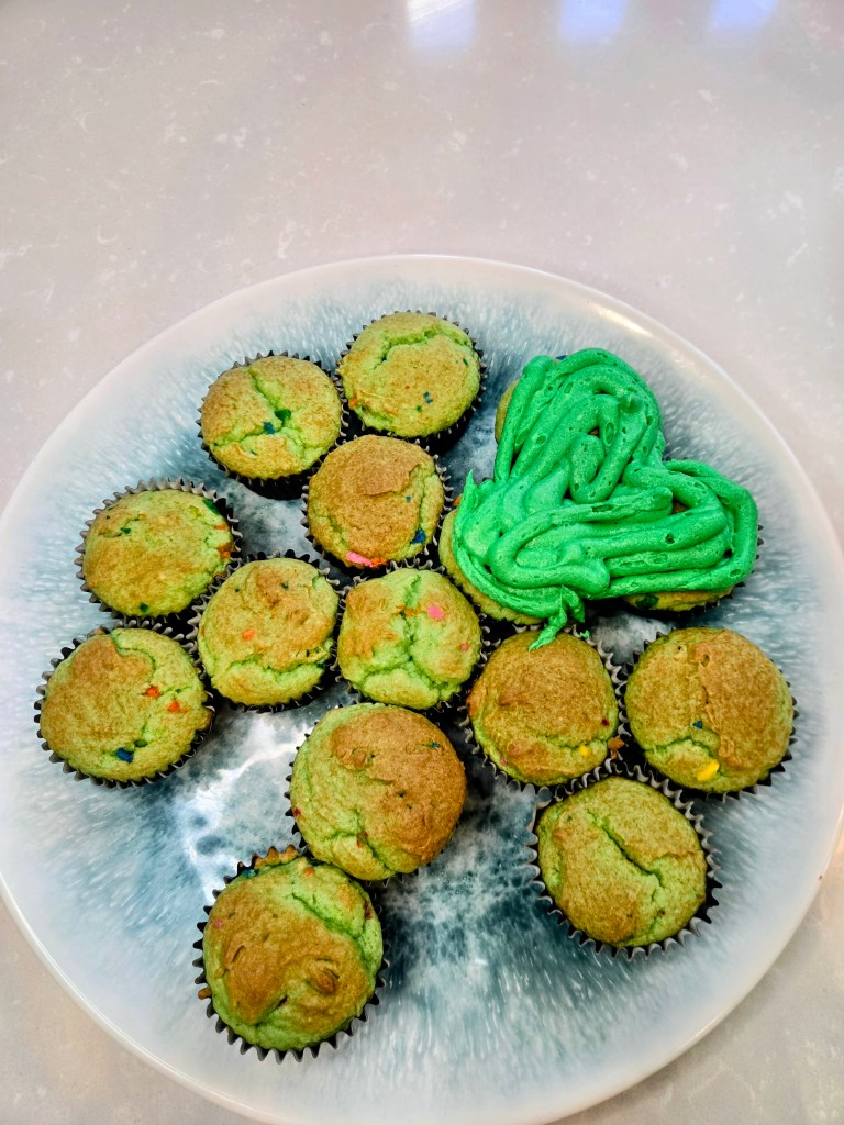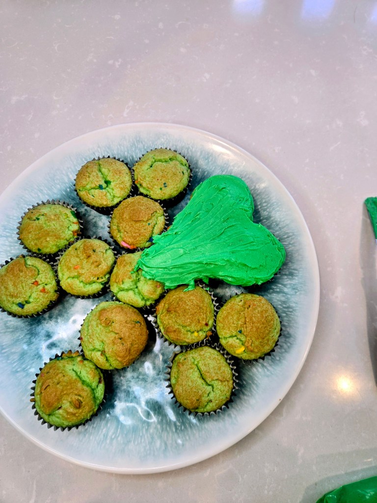 - Add in remaining monkfruit, protein powder, 1/4 cup milk, and 2 TBS Baileys, mixing well. If making the clover cupcakes, be sure to dye your frosting with green gel dye at this point.