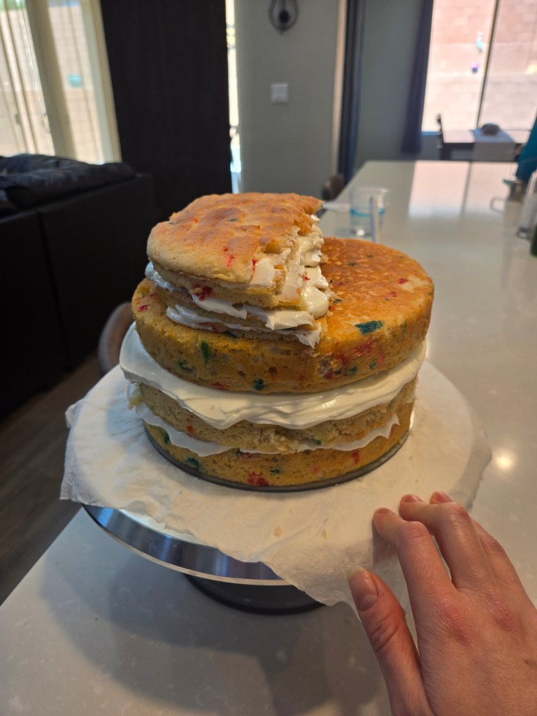 Whip the cream cheese and yogurt with a paddle attachment in your stand mixer until fluffy, about three minutes. Add in half the monkfruit, citric acid, and both extracts. Blend well, then scrape the bowl before adding the remaining monkfruit and 3 TBS Baileys; if the frosting is too stiff, add another TBS Baileys; add in a tiny amount of green gel dye at this point (we’ll make greener in a minute). To assemble, you just need to slather a layer of buttercream on top of a cooled cake layer, then add another layer (I always place them face down so the smooth surface on the bottom of the cake is now on top), then place the final layer on top. Then coat the side (you don’t have to coat the top yet) of the cake with light green frosting. Place this in the freezer for 15 minutes, then come back in with a Viva paper towel and smooth out any unevenness by gently smoothing your hand back and forth, up and down over the paper towel while it’s resting against the sides of the cake.