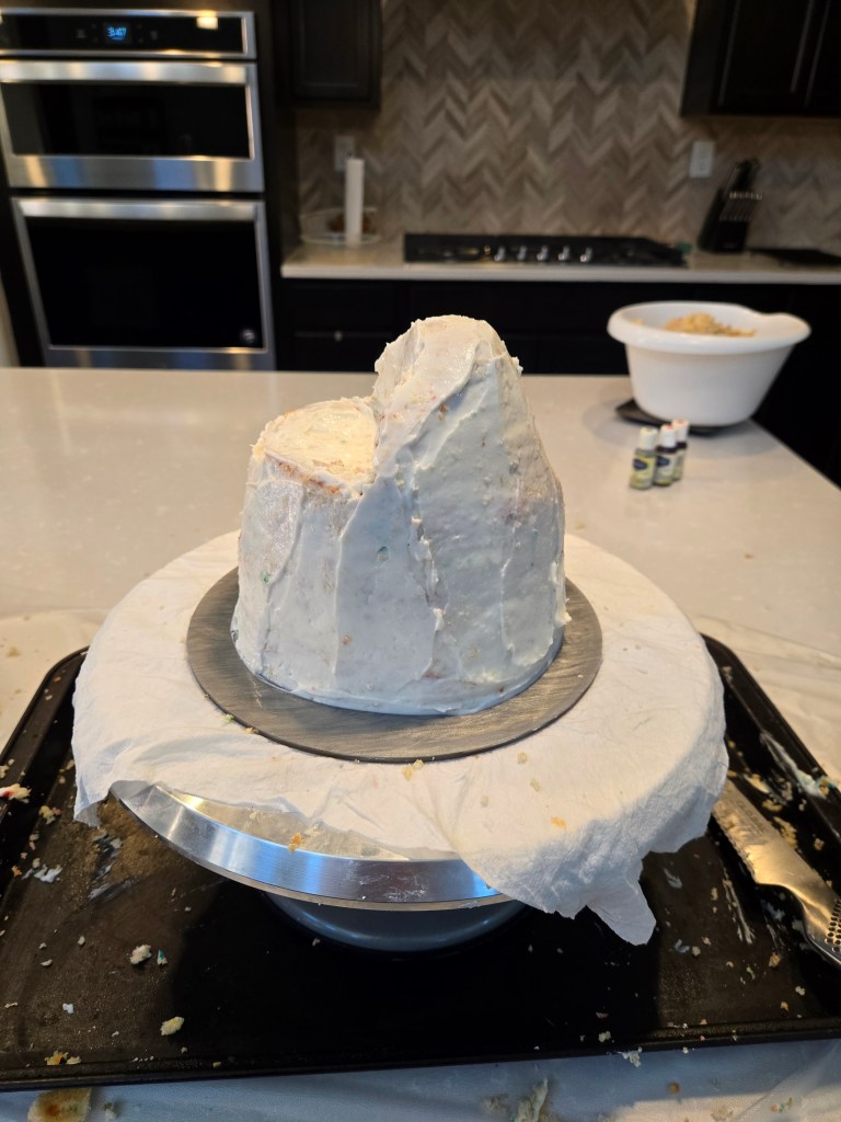 - Crumb coat the entire cake in a thin layer of white frosting and freeze for at least one hour.