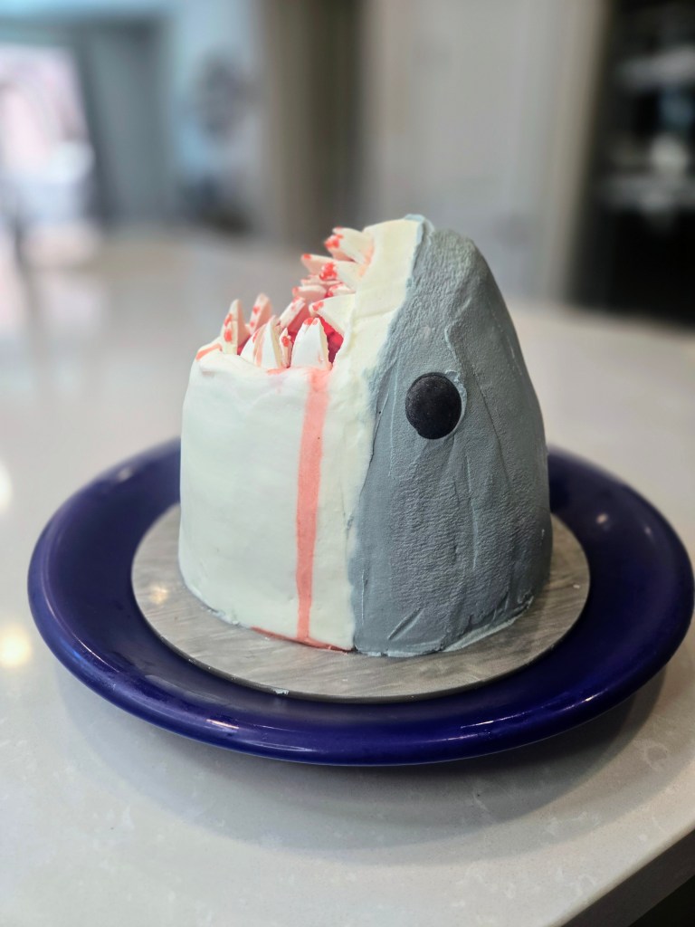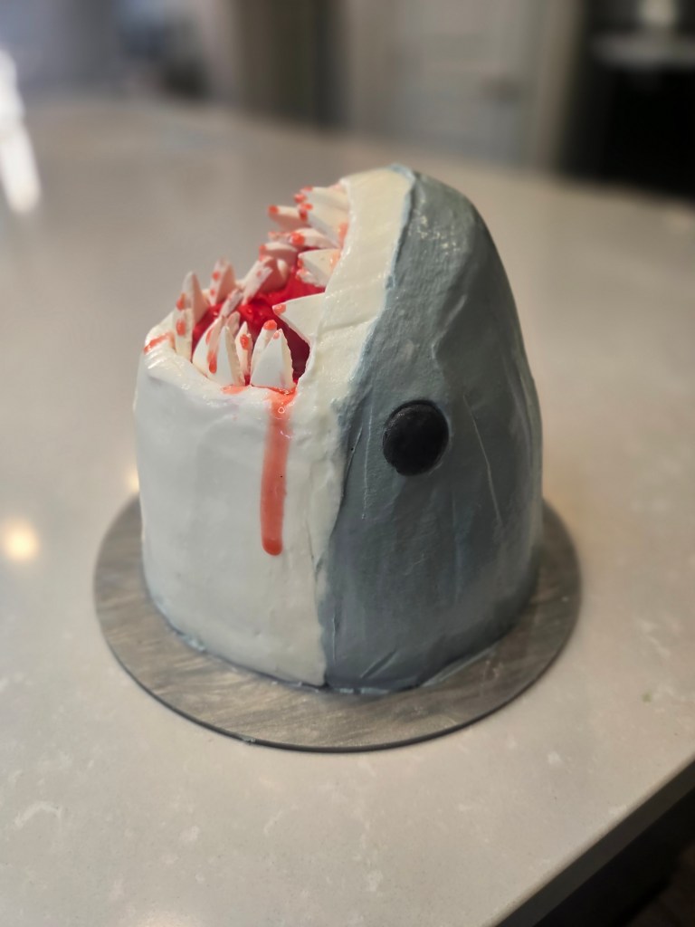 Every time I open the fridge, it’s like looking into a mirror. Don’t get stuck between a rock and a shark place–watch the video tutorial to learn how to carve your own! I definitely recommend carving til your shark it a lot pointier on top than mine is. I followed along with this YouTube tutorial, and it was SO HELPFUL. My nose layers just felt really flimsy, so I was afraid to cut into them to make them more narrow. If I hadn’t been SO EXCITED to make this cake, I would’ve frozen him for a few hours and carved into him more. Either way, this is a cake I have been dreaming up for a few years, so I’m thankful he turned out okay (and that my favorite shark is a great white and not a hammerhead, because LORD that would’ve been difficult to make). He might look like a sandworm from Dune when you’re looking at his mouth head-on, and a few times during carving I had to ask myself if this was a shark cake or a cake, um, more appropriate for a bachelorette party, but in the end, he definitely looks like a shark and not something you need to shield your children’s eyes from. Unless your kids are scared of sharks. Then sit them in front of Discovery Channel all week so they can discover a healthy fascination for some of the longest surviving creatures on the planet. ‘Til next time, my fellow eaters!