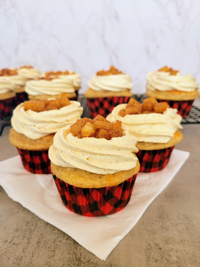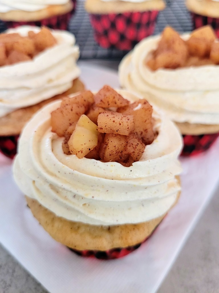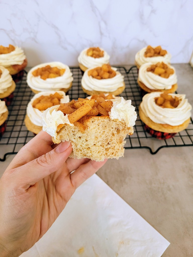 Soft, fluffy cupcakes with whipped frosting and apple topping
